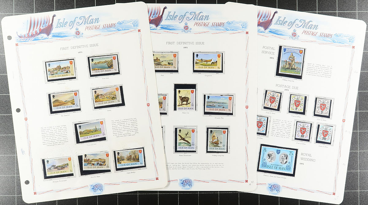 Collection of primarily never hinged Isle of Man, 1958-1987, containing roughly 750 stamps in hingeless White Ace album pages or stock pages, in a binder with slipcase. The collection ranges from Scott #1/339, containing several sets (2 each in some cases), a few souvenir sheets, along with a bit of used on some pages. A nice collection that should be continued until completion. Owner's 2026 Scott US$401.00 =
