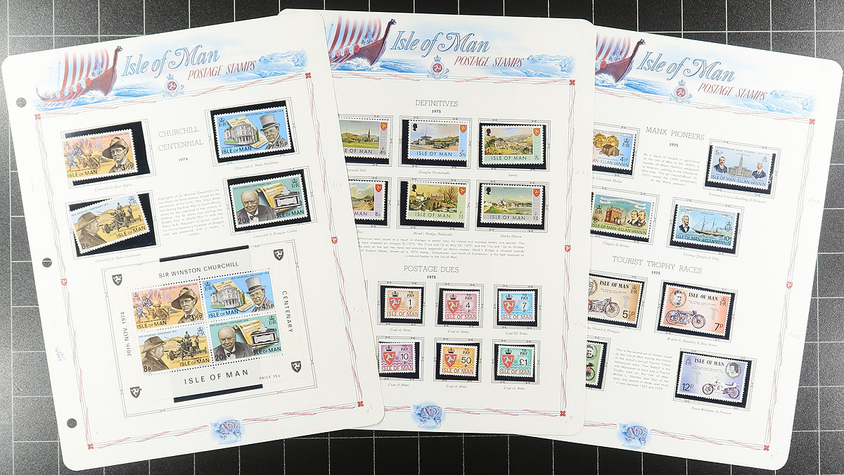Collection of primarily never hinged Isle of Man, 1958-1987, containing roughly 750 stamps in hingeless White Ace album pages or stock pages, in a binder with slipcase. The collection ranges from Scott #1/339, containing several sets (2 each in some cases), a few souvenir sheets, along with a bit of used on some pages. A nice collection that should be continued until completion. Owner's 2026 Scott US$401.00 =