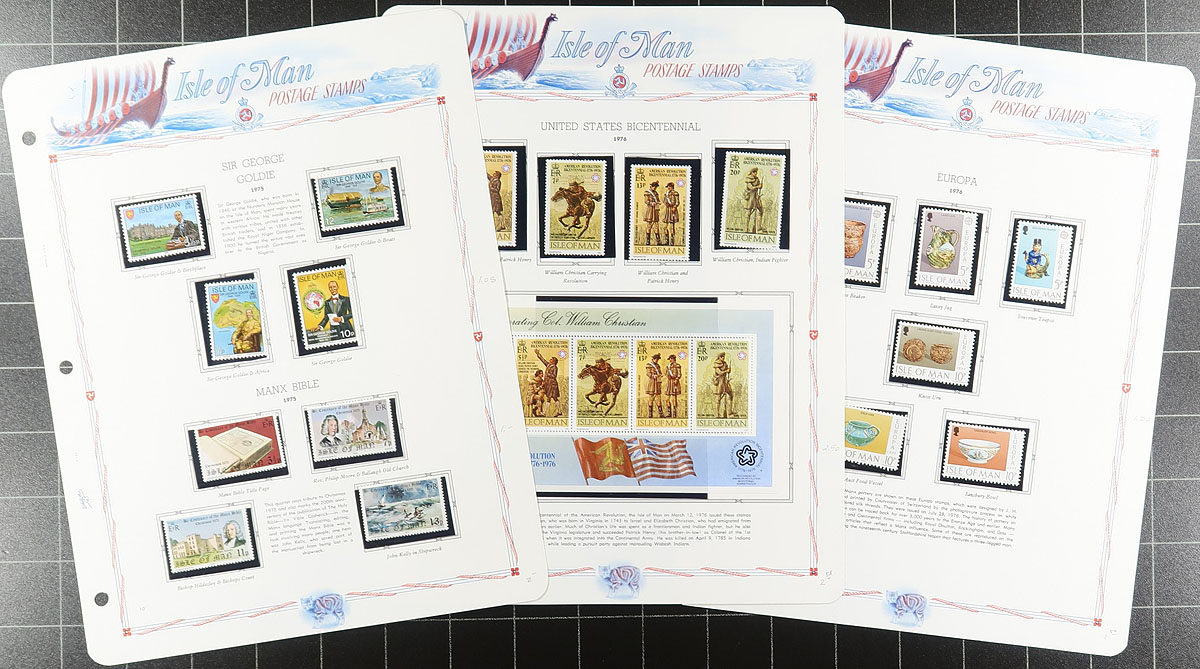 Collection of primarily never hinged Isle of Man, 1958-1987, containing roughly 750 stamps in hingeless White Ace album pages or stock pages, in a binder with slipcase. The collection ranges from Scott #1/339, containing several sets (2 each in some cases), a few souvenir sheets, along with a bit of used on some pages. A nice collection that should be continued until completion. Owner's 2026 Scott US$401.00 =