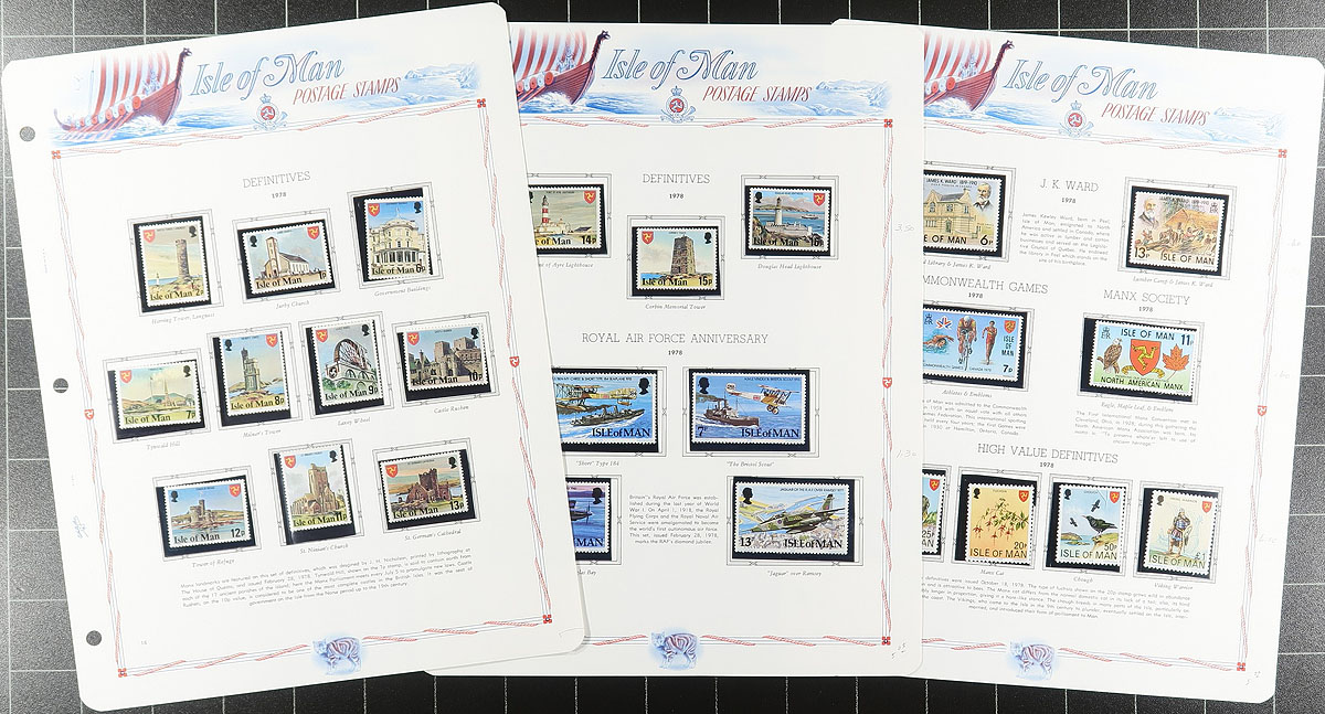 Collection of primarily never hinged Isle of Man, 1958-1987, containing roughly 750 stamps in hingeless White Ace album pages or stock pages, in a binder with slipcase. The collection ranges from Scott #1/339, containing several sets (2 each in some cases), a few souvenir sheets, along with a bit of used on some pages. A nice collection that should be continued until completion. Owner's 2026 Scott US$401.00 =