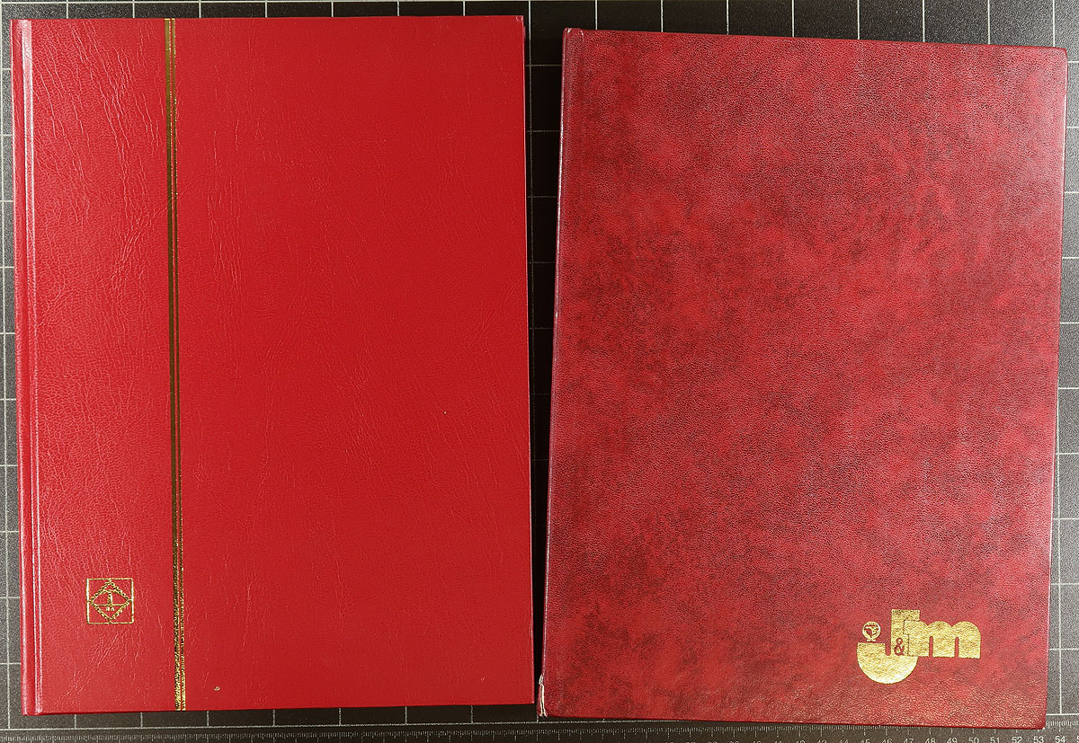 Bankers box full of miscellaneous supplies including 3 stockbooks, 4 springback albums with quadrille pages (most have pencil notations on pages), loose stock pages, 2 albums with Vario-style stock pages (mostly 4 pocket for plate blocks), and more. Condition is mostly used to a few lightly used, still useful to all stamp collectors at a fraction of the original retail price. Estimate =
