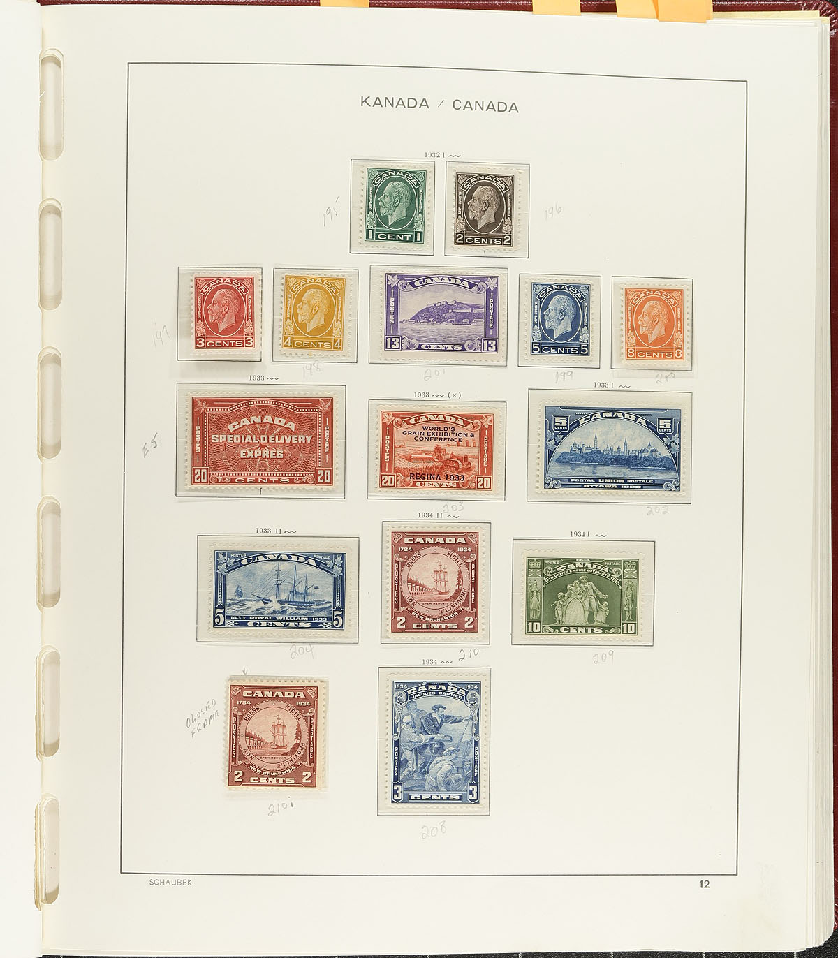 Mint collection of Canada in a hingeless Schaubek album with slipcase, 1870-1980, containing many hundreds of stamps. The collection ranges from Scott #35/877, including back of the book issues, and strength with coil singles and pairs, beginning with a few Small Queens, Jubilees (1/2c to 50c), partial sets of Leafs, Numerals, Edwards, Quebecs, Admirals, Scrolls and Arch issues. The lot continues with a few complete sets noting Medallion (mh, c.v. $142 total), 1935 Pictorial (nh, $182 total), hinged War issues, and never hinged Peace issues. The collection appears to be in mixed condition up to the 1930's (a few no gum and other small faults), with a mixture of hinged and never hinged post 1935 (we estimate 95% completeness after this date). A spot check still revealed a few better stamps including #s 82-83 (mh, $975), 110, 115, 117 (mh, $170 total), along with a few other singles including coil singles and pairs cataloguing $20 and up. A good collection with lots of potential and should be worth our conservative estimate. Estimate =
