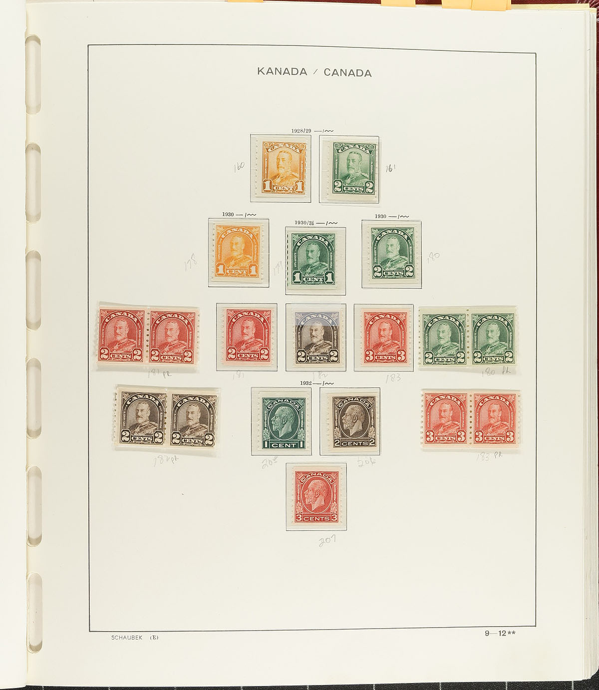 Mint collection of Canada in a hingeless Schaubek album with slipcase, 1870-1980, containing many hundreds of stamps. The collection ranges from Scott #35/877, including back of the book issues, and strength with coil singles and pairs, beginning with a few Small Queens, Jubilees (1/2c to 50c), partial sets of Leafs, Numerals, Edwards, Quebecs, Admirals, Scrolls and Arch issues. The lot continues with a few complete sets noting Medallion (mh, c.v. $142 total), 1935 Pictorial (nh, $182 total), hinged War issues, and never hinged Peace issues. The collection appears to be in mixed condition up to the 1930's (a few no gum and other small faults), with a mixture of hinged and never hinged post 1935 (we estimate 95% completeness after this date). A spot check still revealed a few better stamps including #s 82-83 (mh, $975), 110, 115, 117 (mh, $170 total), along with a few other singles including coil singles and pairs cataloguing $20 and up. A good collection with lots of potential and should be worth our conservative estimate. Estimate =