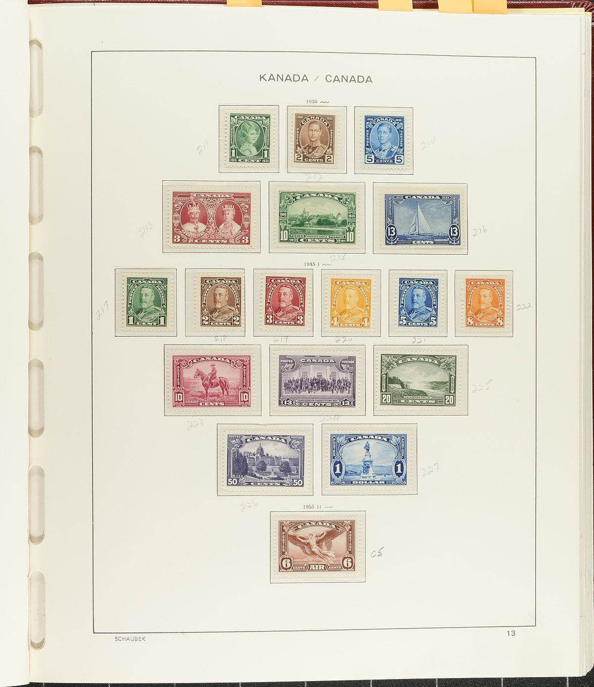 Mint collection of Canada in a hingeless Schaubek album with slipcase, 1870-1980, containing many hundreds of stamps. The collection ranges from Scott #35/877, including back of the book issues, and strength with coil singles and pairs, beginning with a few Small Queens, Jubilees (1/2c to 50c), partial sets of Leafs, Numerals, Edwards, Quebecs, Admirals, Scrolls and Arch issues. The lot continues with a few complete sets noting Medallion (mh, c.v. $142 total), 1935 Pictorial (nh, $182 total), hinged War issues, and never hinged Peace issues. The collection appears to be in mixed condition up to the 1930's (a few no gum and other small faults), with a mixture of hinged and never hinged post 1935 (we estimate 95% completeness after this date). A spot check still revealed a few better stamps including #s 82-83 (mh, $975), 110, 115, 117 (mh, $170 total), along with a few other singles including coil singles and pairs cataloguing $20 and up. A good collection with lots of potential and should be worth our conservative estimate. Estimate =