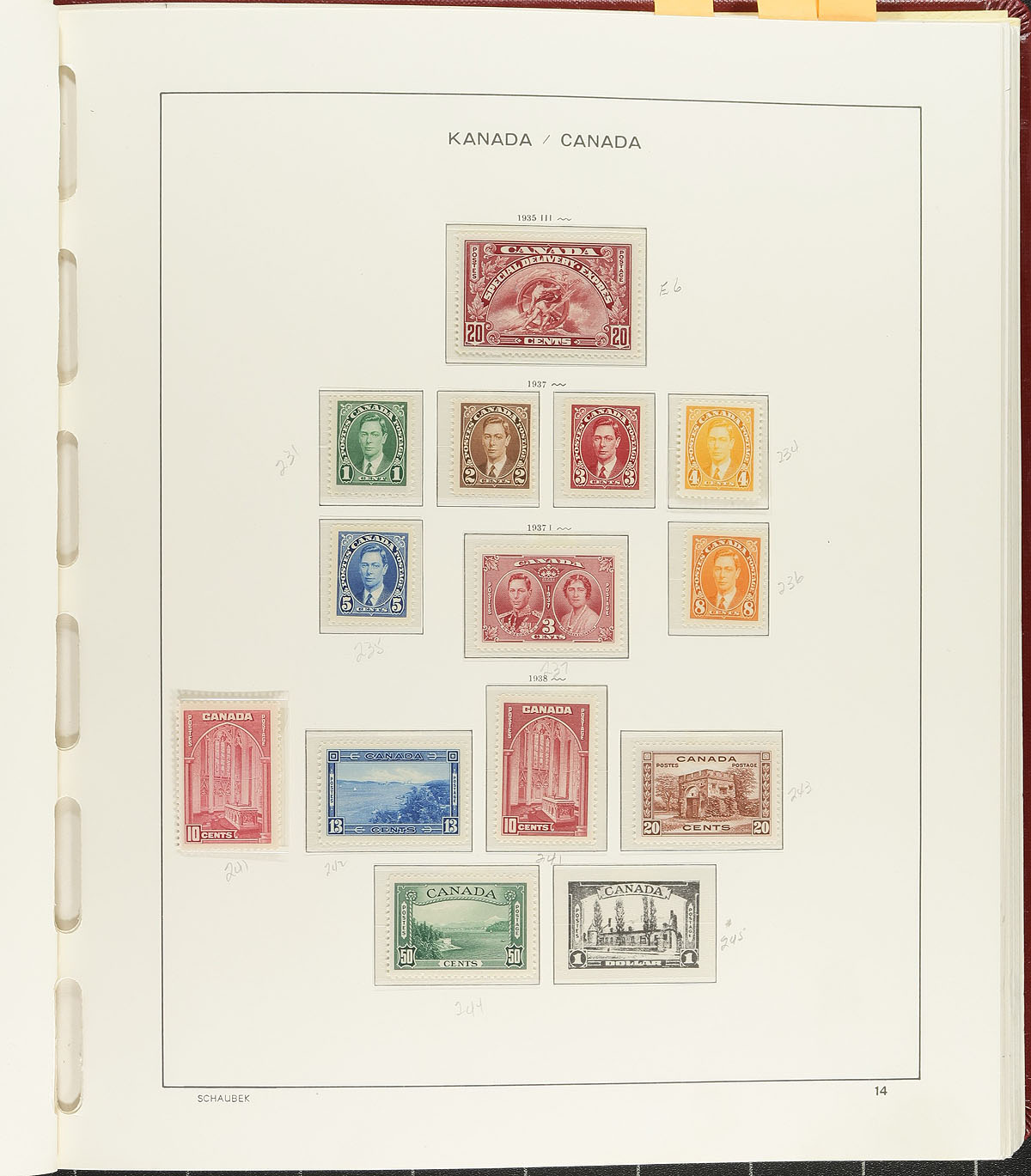 Mint collection of Canada in a hingeless Schaubek album with slipcase, 1870-1980, containing many hundreds of stamps. The collection ranges from Scott #35/877, including back of the book issues, and strength with coil singles and pairs, beginning with a few Small Queens, Jubilees (1/2c to 50c), partial sets of Leafs, Numerals, Edwards, Quebecs, Admirals, Scrolls and Arch issues. The lot continues with a few complete sets noting Medallion (mh, c.v. $142 total), 1935 Pictorial (nh, $182 total), hinged War issues, and never hinged Peace issues. The collection appears to be in mixed condition up to the 1930's (a few no gum and other small faults), with a mixture of hinged and never hinged post 1935 (we estimate 95% completeness after this date). A spot check still revealed a few better stamps including #s 82-83 (mh, $975), 110, 115, 117 (mh, $170 total), along with a few other singles including coil singles and pairs cataloguing $20 and up. A good collection with lots of potential and should be worth our conservative estimate. Estimate =