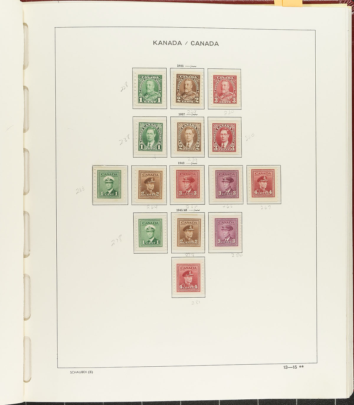 Mint collection of Canada in a hingeless Schaubek album with slipcase, 1870-1980, containing many hundreds of stamps. The collection ranges from Scott #35/877, including back of the book issues, and strength with coil singles and pairs, beginning with a few Small Queens, Jubilees (1/2c to 50c), partial sets of Leafs, Numerals, Edwards, Quebecs, Admirals, Scrolls and Arch issues. The lot continues with a few complete sets noting Medallion (mh, c.v. $142 total), 1935 Pictorial (nh, $182 total), hinged War issues, and never hinged Peace issues. The collection appears to be in mixed condition up to the 1930's (a few no gum and other small faults), with a mixture of hinged and never hinged post 1935 (we estimate 95% completeness after this date). A spot check still revealed a few better stamps including #s 82-83 (mh, $975), 110, 115, 117 (mh, $170 total), along with a few other singles including coil singles and pairs cataloguing $20 and up. A good collection with lots of potential and should be worth our conservative estimate. Estimate =