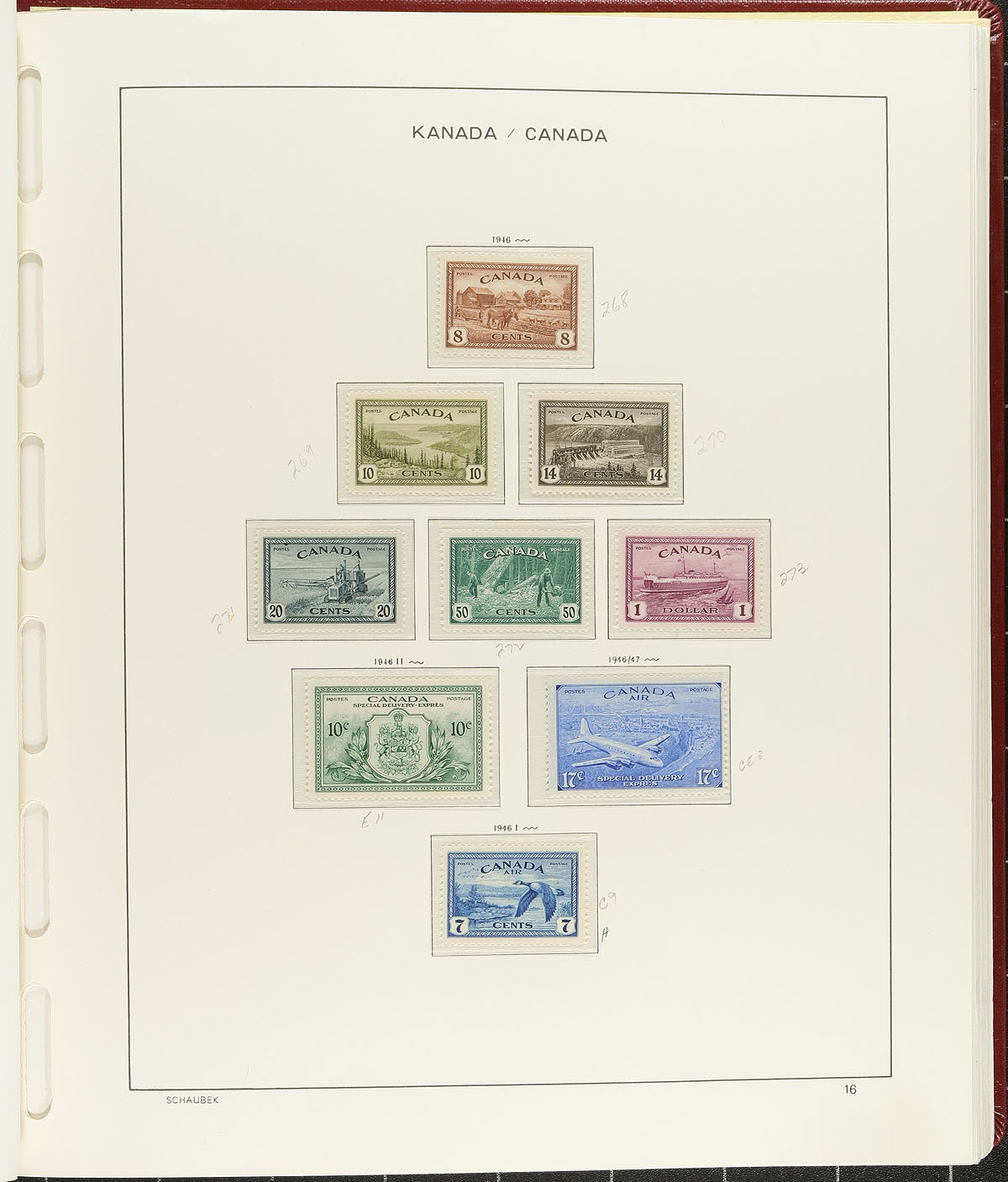 Mint collection of Canada in a hingeless Schaubek album with slipcase, 1870-1980, containing many hundreds of stamps. The collection ranges from Scott #35/877, including back of the book issues, and strength with coil singles and pairs, beginning with a few Small Queens, Jubilees (1/2c to 50c), partial sets of Leafs, Numerals, Edwards, Quebecs, Admirals, Scrolls and Arch issues. The lot continues with a few complete sets noting Medallion (mh, c.v. $142 total), 1935 Pictorial (nh, $182 total), hinged War issues, and never hinged Peace issues. The collection appears to be in mixed condition up to the 1930's (a few no gum and other small faults), with a mixture of hinged and never hinged post 1935 (we estimate 95% completeness after this date). A spot check still revealed a few better stamps including #s 82-83 (mh, $975), 110, 115, 117 (mh, $170 total), along with a few other singles including coil singles and pairs cataloguing $20 and up. A good collection with lots of potential and should be worth our conservative estimate. Estimate =
