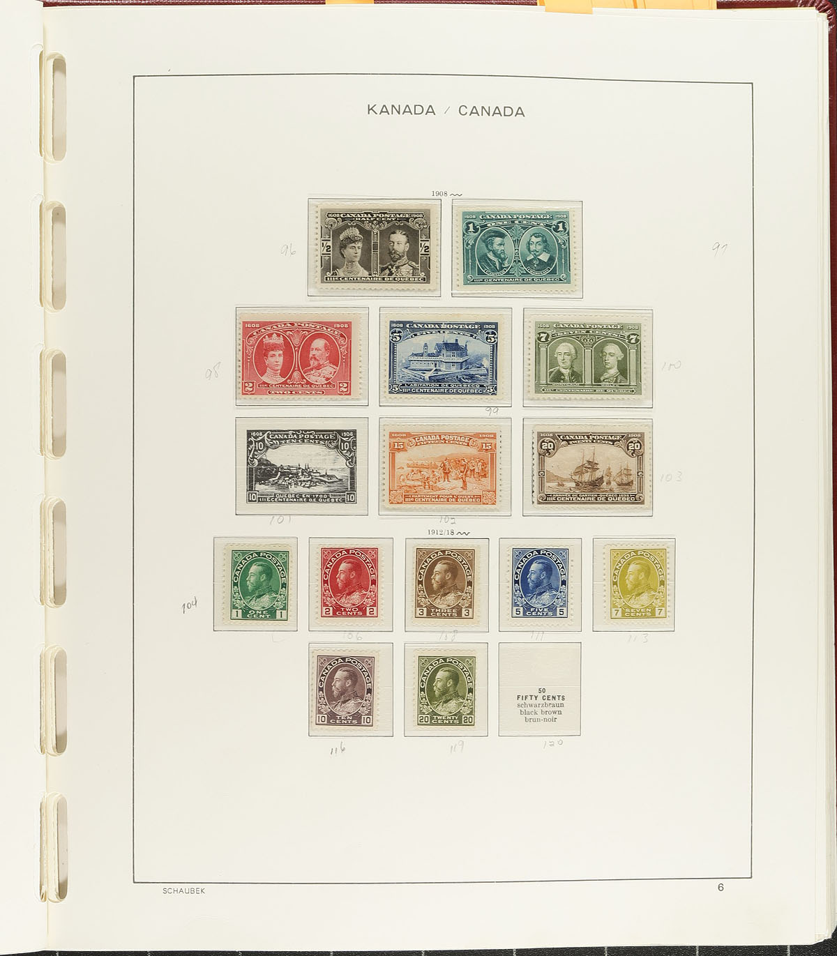 Mint collection of Canada in a hingeless Schaubek album with slipcase, 1870-1980, containing many hundreds of stamps. The collection ranges from Scott #35/877, including back of the book issues, and strength with coil singles and pairs, beginning with a few Small Queens, Jubilees (1/2c to 50c), partial sets of Leafs, Numerals, Edwards, Quebecs, Admirals, Scrolls and Arch issues. The lot continues with a few complete sets noting Medallion (mh, c.v. $142 total), 1935 Pictorial (nh, $182 total), hinged War issues, and never hinged Peace issues. The collection appears to be in mixed condition up to the 1930's (a few no gum and other small faults), with a mixture of hinged and never hinged post 1935 (we estimate 95% completeness after this date). A spot check still revealed a few better stamps including #s 82-83 (mh, $975), 110, 115, 117 (mh, $170 total), along with a few other singles including coil singles and pairs cataloguing $20 and up. A good collection with lots of potential and should be worth our conservative estimate. Estimate =