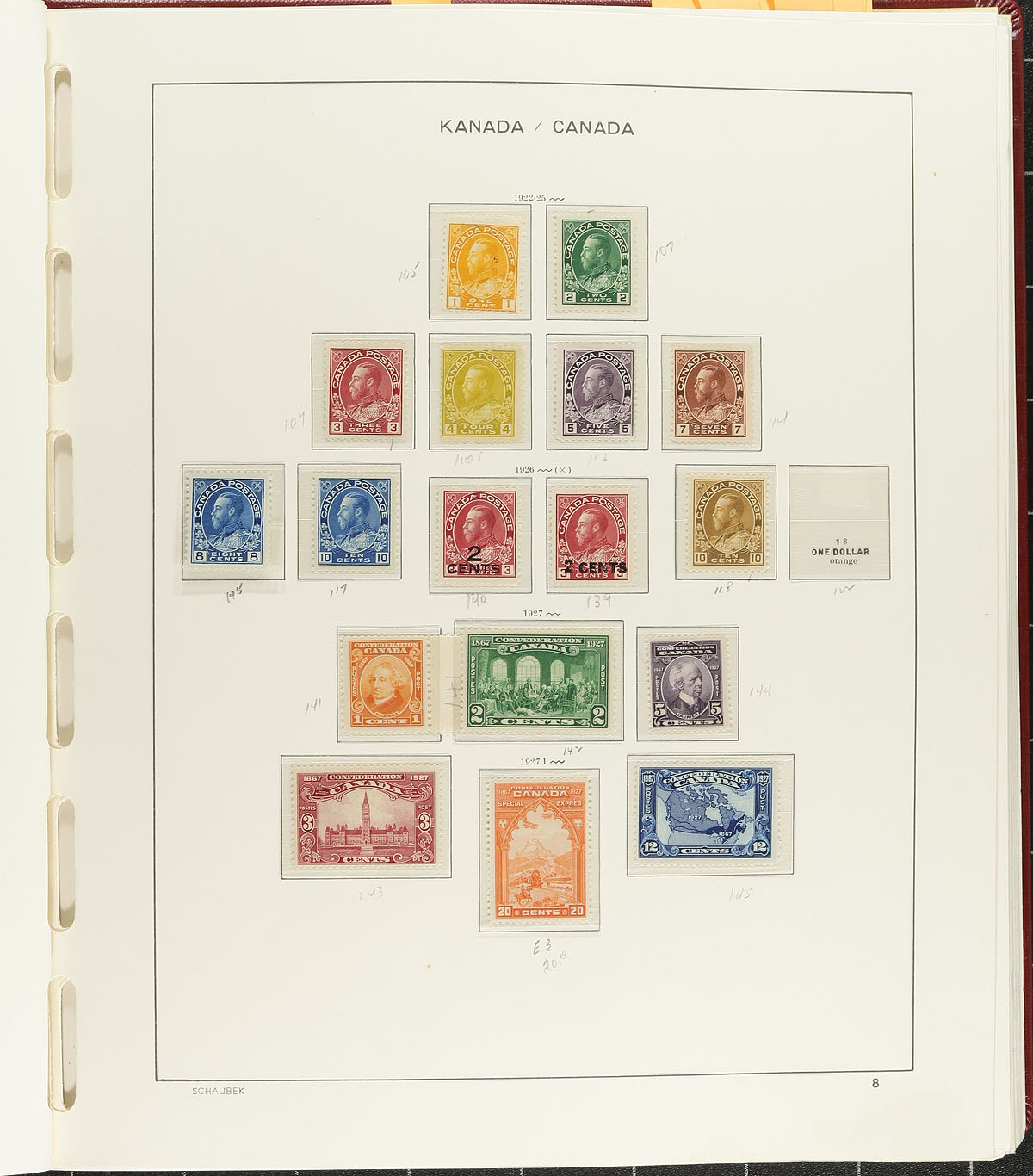 Mint collection of Canada in a hingeless Schaubek album with slipcase, 1870-1980, containing many hundreds of stamps. The collection ranges from Scott #35/877, including back of the book issues, and strength with coil singles and pairs, beginning with a few Small Queens, Jubilees (1/2c to 50c), partial sets of Leafs, Numerals, Edwards, Quebecs, Admirals, Scrolls and Arch issues. The lot continues with a few complete sets noting Medallion (mh, c.v. $142 total), 1935 Pictorial (nh, $182 total), hinged War issues, and never hinged Peace issues. The collection appears to be in mixed condition up to the 1930's (a few no gum and other small faults), with a mixture of hinged and never hinged post 1935 (we estimate 95% completeness after this date). A spot check still revealed a few better stamps including #s 82-83 (mh, $975), 110, 115, 117 (mh, $170 total), along with a few other singles including coil singles and pairs cataloguing $20 and up. A good collection with lots of potential and should be worth our conservative estimate. Estimate =