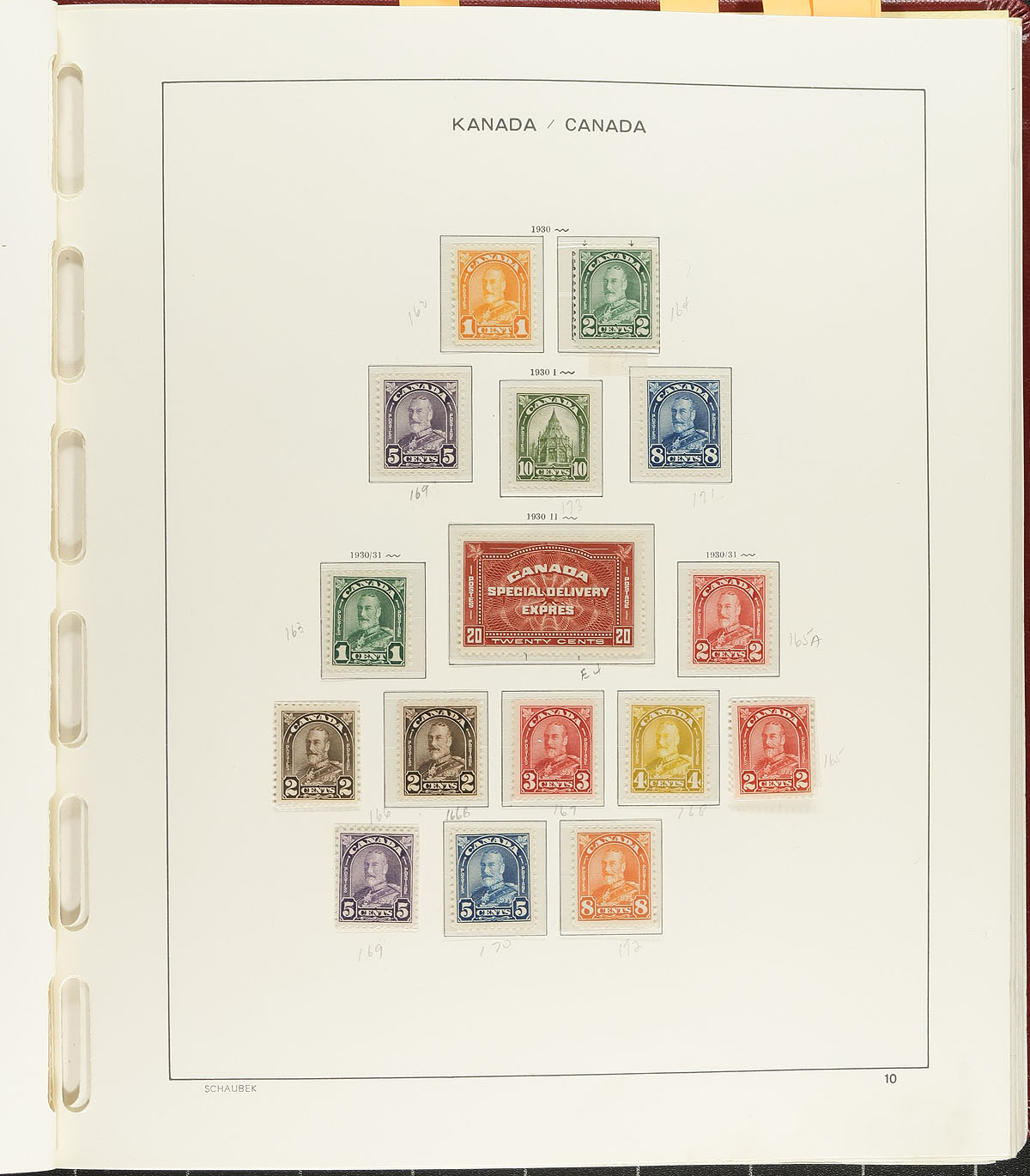 Mint collection of Canada in a hingeless Schaubek album with slipcase, 1870-1980, containing many hundreds of stamps. The collection ranges from Scott #35/877, including back of the book issues, and strength with coil singles and pairs, beginning with a few Small Queens, Jubilees (1/2c to 50c), partial sets of Leafs, Numerals, Edwards, Quebecs, Admirals, Scrolls and Arch issues. The lot continues with a few complete sets noting Medallion (mh, c.v. $142 total), 1935 Pictorial (nh, $182 total), hinged War issues, and never hinged Peace issues. The collection appears to be in mixed condition up to the 1930's (a few no gum and other small faults), with a mixture of hinged and never hinged post 1935 (we estimate 95% completeness after this date). A spot check still revealed a few better stamps including #s 82-83 (mh, $975), 110, 115, 117 (mh, $170 total), along with a few other singles including coil singles and pairs cataloguing $20 and up. A good collection with lots of potential and should be worth our conservative estimate. Estimate =