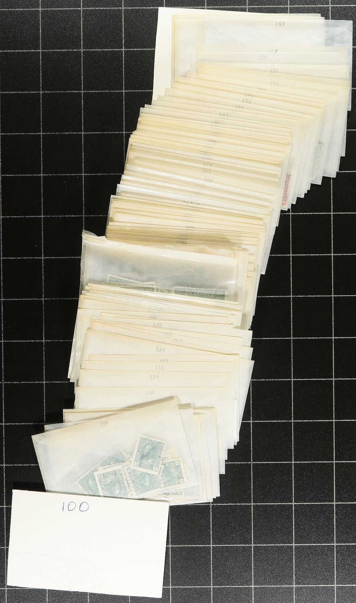 Stock of used Canada, 1897-2014, containing thousands of stamps neatly organized into hundreds of glassines, with each glassine identified by Scott number. The lot ranges from Scott #51/2700, with at least one stamp to many stamps per glassine (a spot check noted 50c Bluenose (x2), and $1 Parliament), with a mixture of definitive and commemorative issues. Completely unchecked for varieties, postmarks, etc. A nice project for the consummate collector. Estimate =