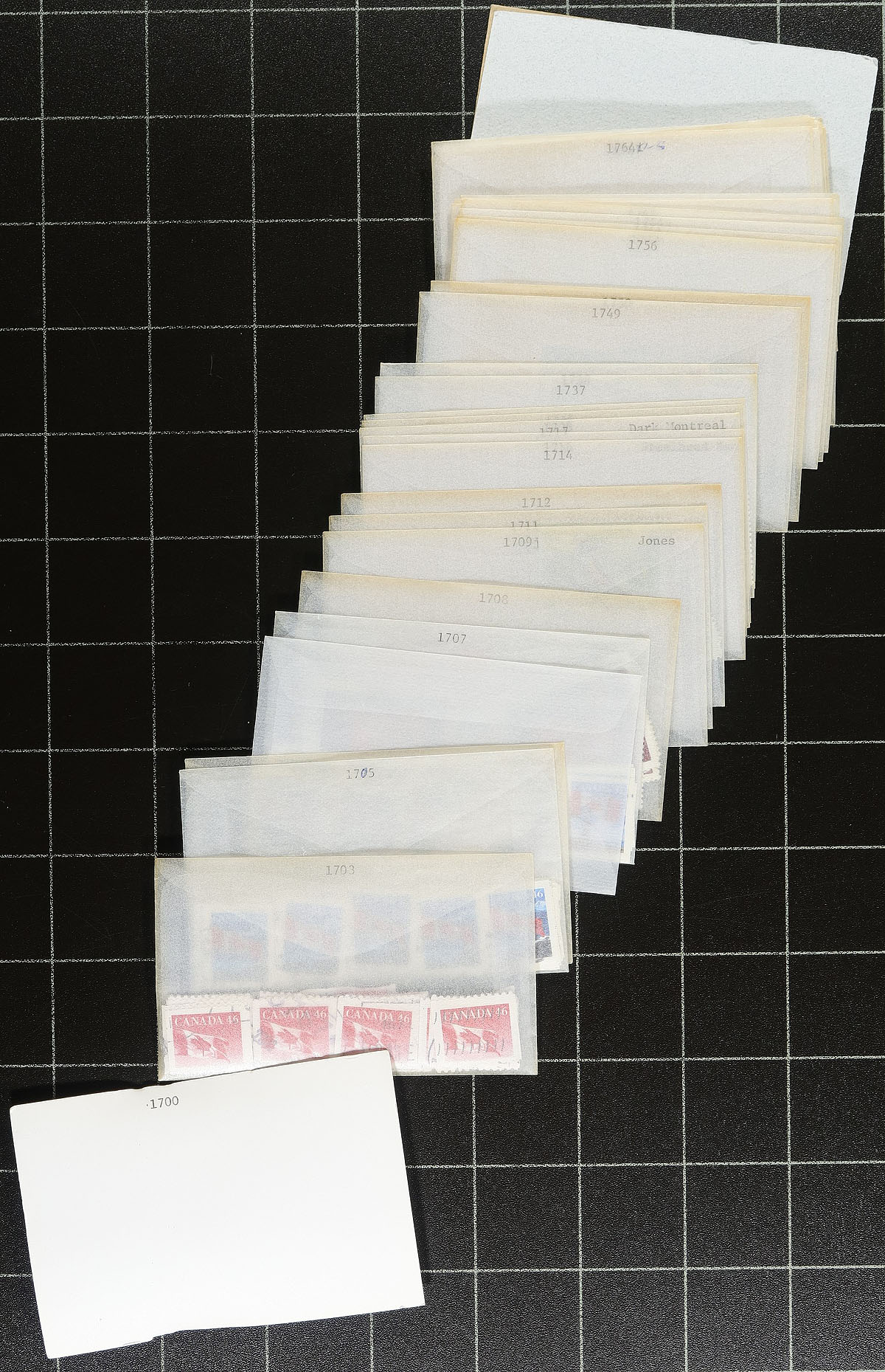 Stock of used Canada, 1897-2014, containing thousands of stamps neatly organized into hundreds of glassines, with each glassine identified by Scott number. The lot ranges from Scott #51/2700, with at least one stamp to many stamps per glassine (a spot check noted 50c Bluenose (x2), and $1 Parliament), with a mixture of definitive and commemorative issues. Completely unchecked for varieties, postmarks, etc. A nice project for the consummate collector. Estimate =