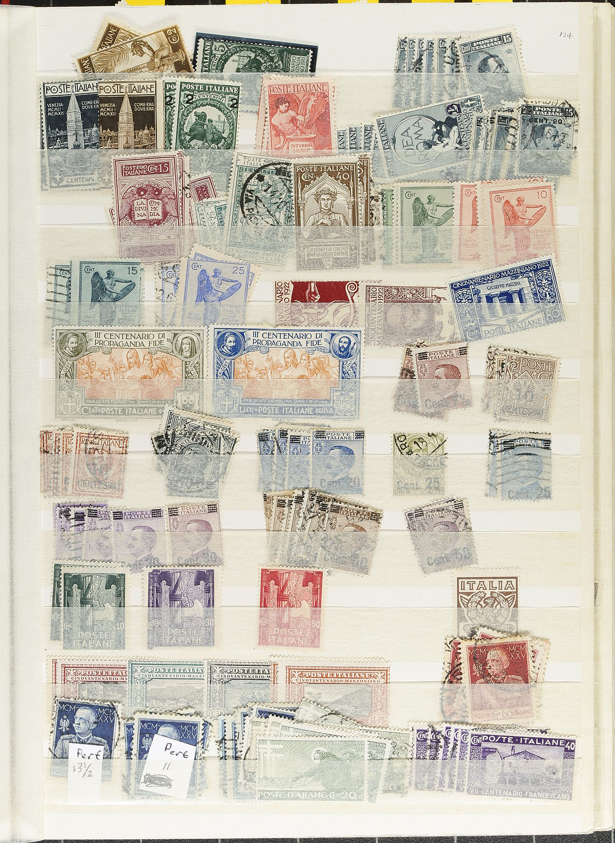 Huge Stock of used Italy, 1862-1999, containing many thousands of stamps in a thick 48 page Lighthouse stockbook. The lot generally ranges from Scott #19/2300, including several back of the book issues including postage dues, airmail, special delivery, parcel posts, and more. A spot check indicated some issues cataloguing $3 and up, with duplication up to 10 for some issues, and unchecked for better postmarks including 'socked on the nose' town cancels. The lot also includes 7 'approval books' from Saskatoon Stamp Centre. A nice lot for the Italy enthusiast, with potential finds for the dedicated collector, overall fine to very fine. Estimate =
