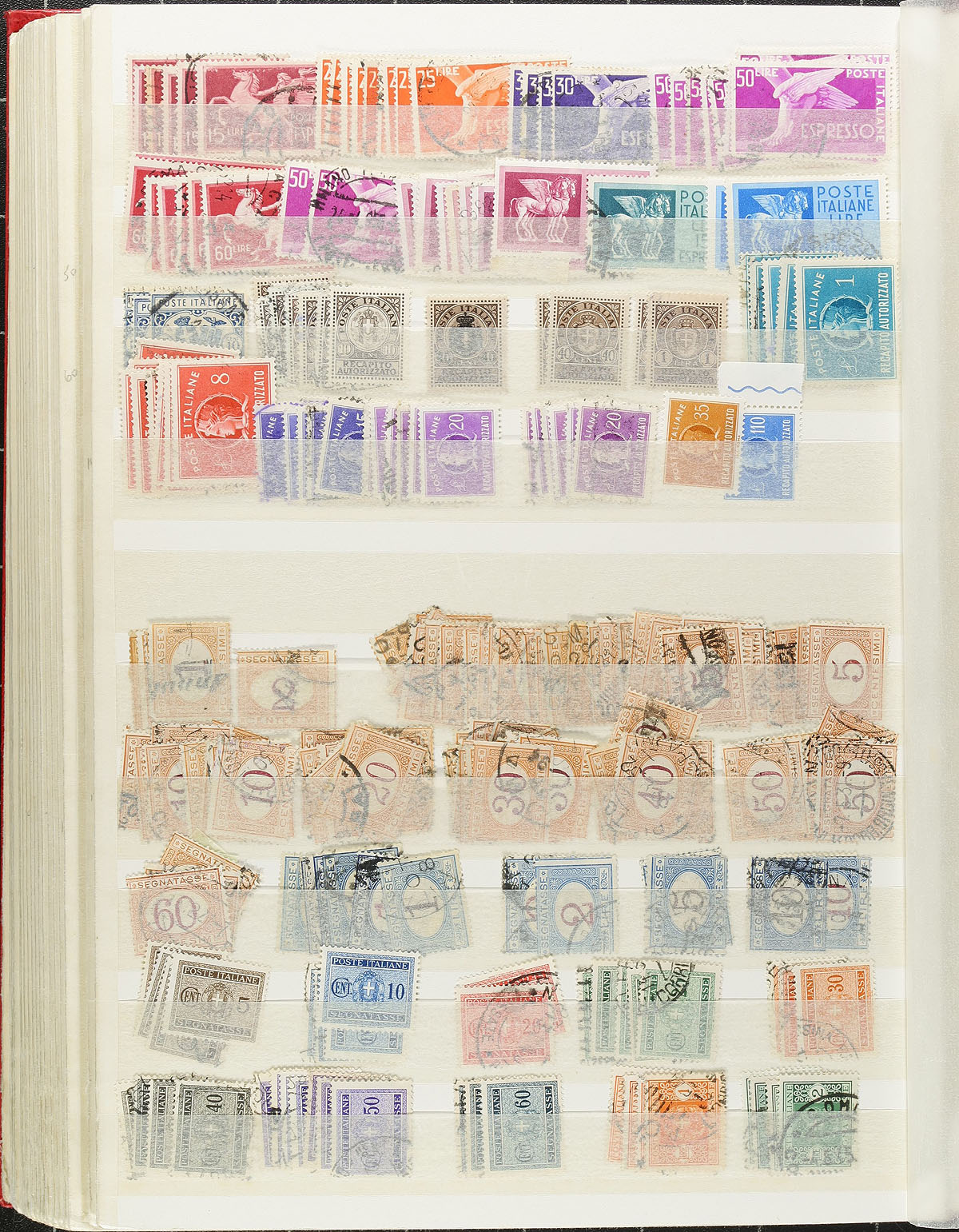 Huge Stock of used Italy, 1862-1999, containing many thousands of stamps in a thick 48 page Lighthouse stockbook. The lot generally ranges from Scott #19/2300, including several back of the book issues including postage dues, airmail, special delivery, parcel posts, and more. A spot check indicated some issues cataloguing $3 and up, with duplication up to 10 for some issues, and unchecked for better postmarks including 'socked on the nose' town cancels. The lot also includes 7 'approval books' from Saskatoon Stamp Centre. A nice lot for the Italy enthusiast, with potential finds for the dedicated collector, overall fine to very fine. Estimate =