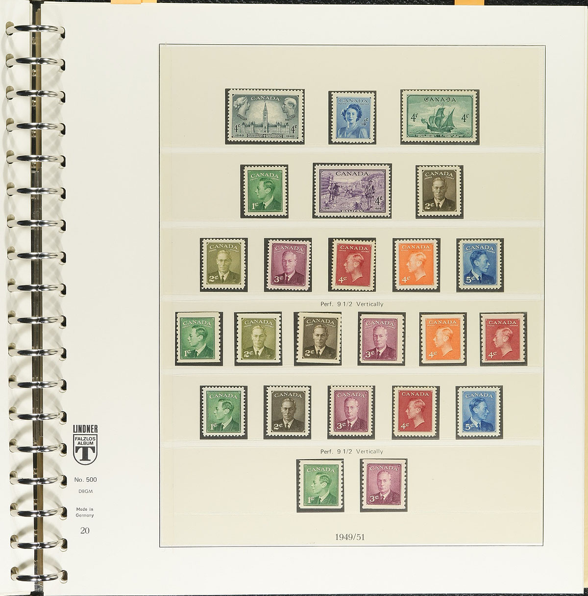 Collection of mostly never hinged Canada in a hingeless Lindner album with slipcase, 1897-1971, containing many hundreds of stamps. The collection ranges from Scott #66/553, along with a small selection of back of the book issues, very sparsely filled up to 1950, with virtual completion thereafter. We note a few items cataloguing in the $10 and up range, but it is essentially a nice starter collection in a high retailing album, and should be worth our low estimate. Estimate =