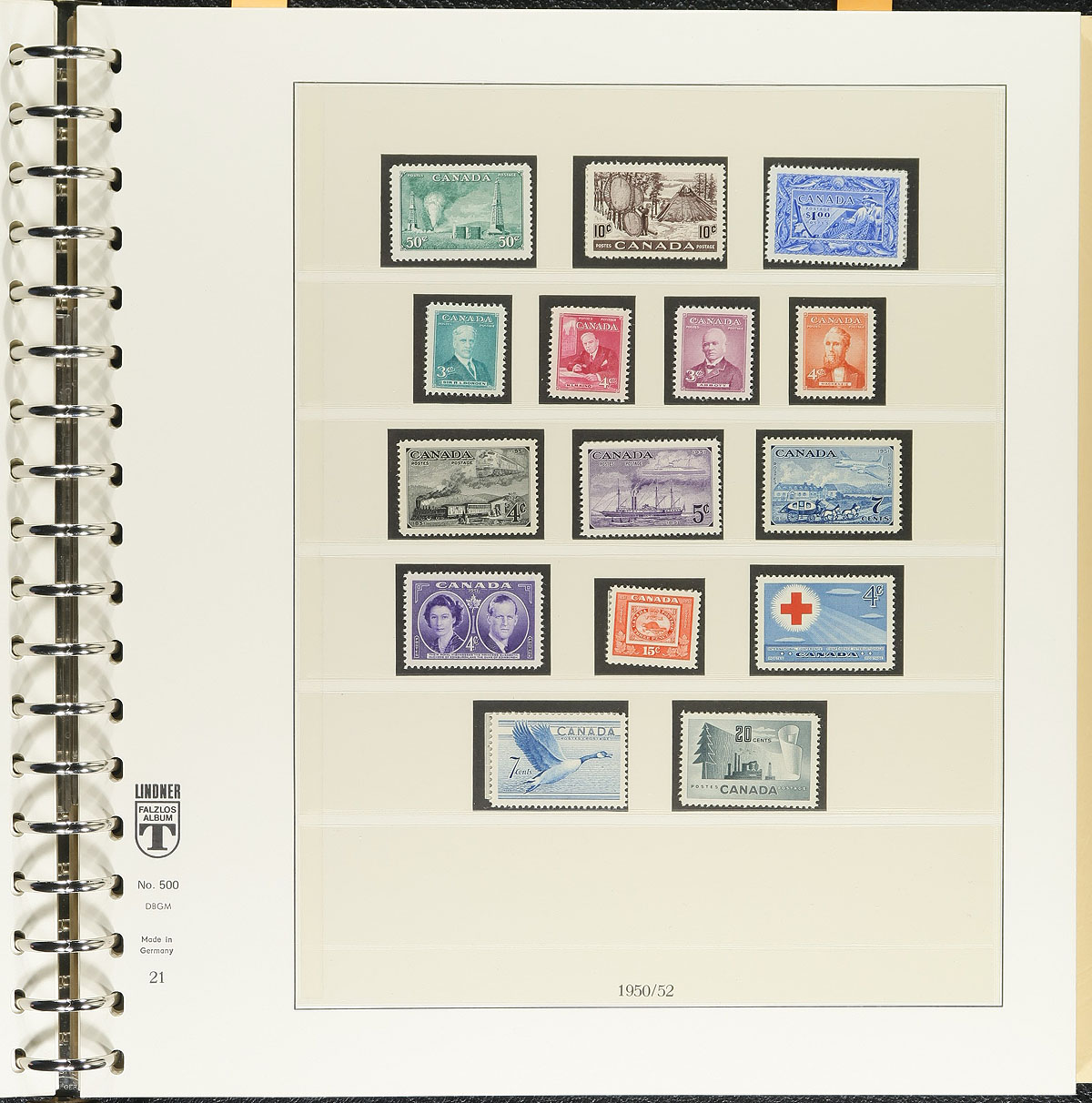 Collection of mostly never hinged Canada in a hingeless Lindner album with slipcase, 1897-1971, containing many hundreds of stamps. The collection ranges from Scott #66/553, along with a small selection of back of the book issues, very sparsely filled up to 1950, with virtual completion thereafter. We note a few items cataloguing in the $10 and up range, but it is essentially a nice starter collection in a high retailing album, and should be worth our low estimate. Estimate =