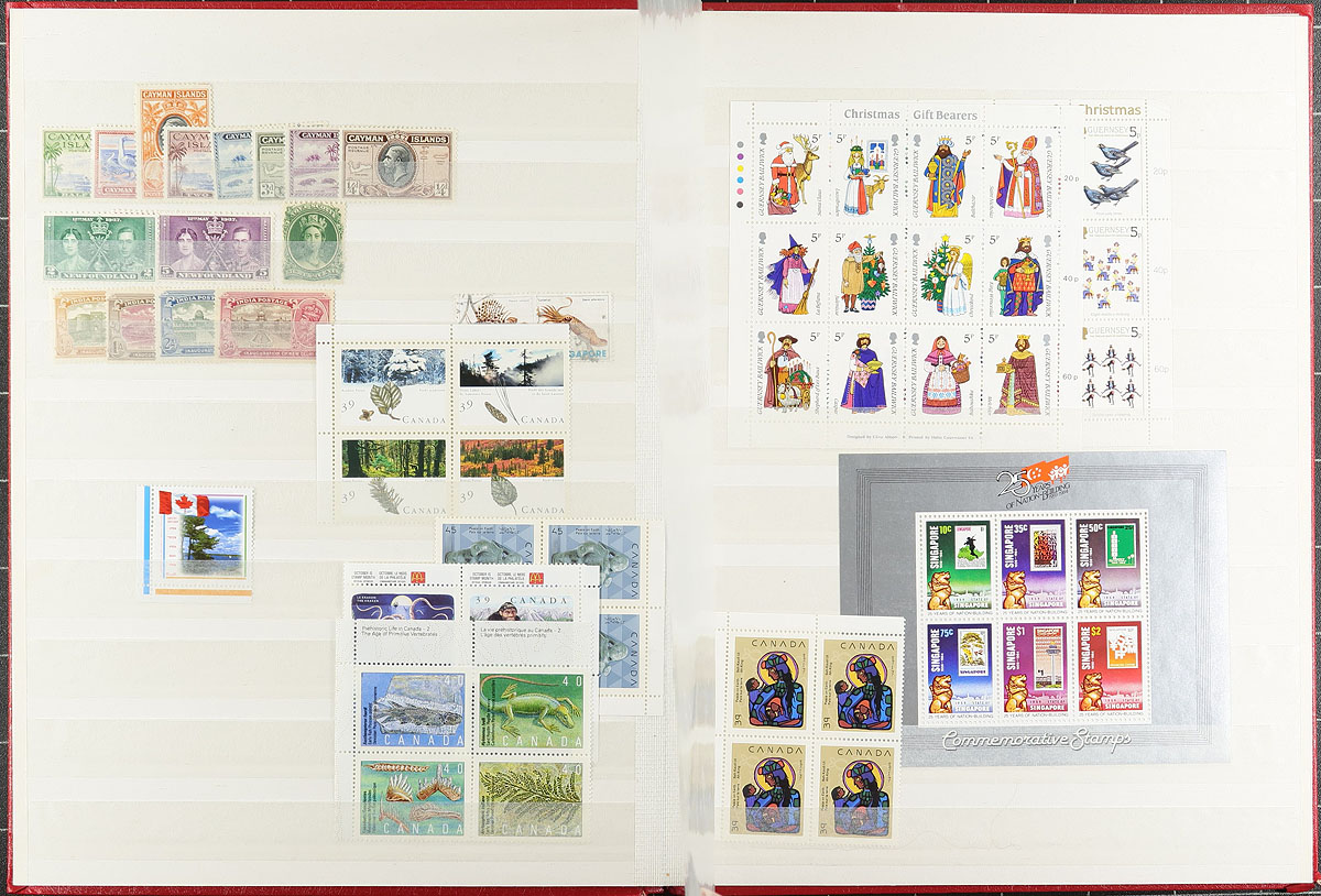 Nice consignment remainders of primarily mint worldwide material, 1900-1990's, in a stockbook, 2 albums, and loose material. There is quite a bit to digest here, with the strength of material in the stockbook, noting several British Commonwealth sets and partial sets, generally ranging from the 1930's to the 1950's, from Hong Kong, Canada (mh 50c Bluenose, Scott c.v. $245.00), India, Malay area, and more, with a spot check indicating some material cataloguing $20 to $40 each. The albums are sparsely filled with British Commonwealth material from countries ranging from F to Z, but did spot some sets and partial sets in the $10 to $20 catalogue range. We estimate roughly $50 of Canada face value postage as an added bonus. A very nice lot for collectors or dealers looking for stock. Estimate =