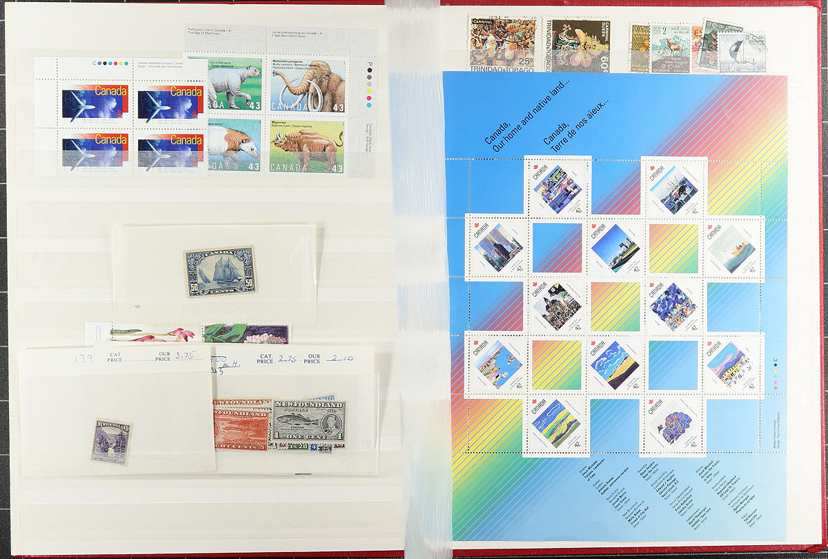 Nice consignment remainders of primarily mint worldwide material, 1900-1990's, in a stockbook, 2 albums, and loose material. There is quite a bit to digest here, with the strength of material in the stockbook, noting several British Commonwealth sets and partial sets, generally ranging from the 1930's to the 1950's, from Hong Kong, Canada (mh 50c Bluenose, Scott c.v. $245.00), India, Malay area, and more, with a spot check indicating some material cataloguing $20 to $40 each. The albums are sparsely filled with British Commonwealth material from countries ranging from F to Z, but did spot some sets and partial sets in the $10 to $20 catalogue range. We estimate roughly $50 of Canada face value postage as an added bonus. A very nice lot for collectors or dealers looking for stock. Estimate =