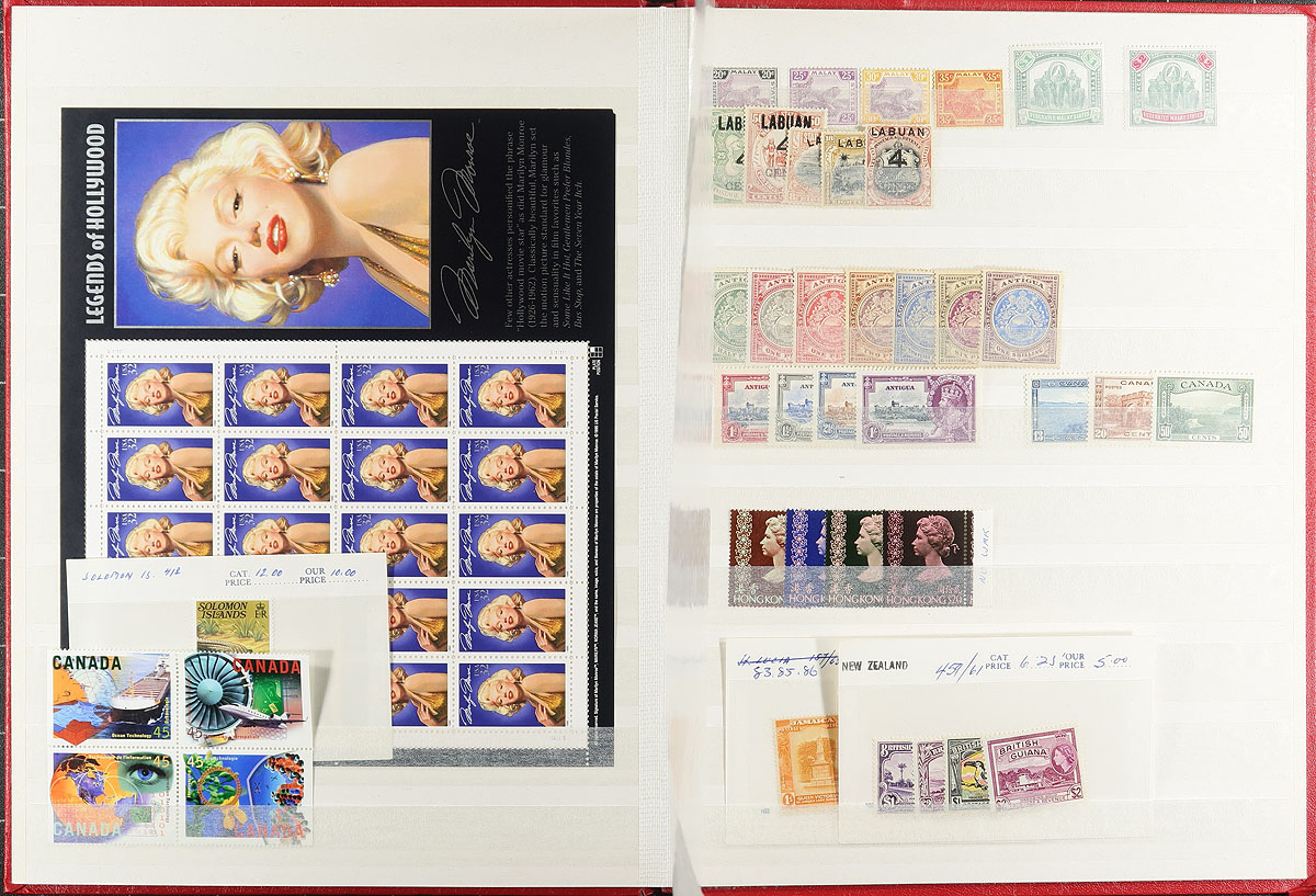 Nice consignment remainders of primarily mint worldwide material, 1900-1990's, in a stockbook, 2 albums, and loose material. There is quite a bit to digest here, with the strength of material in the stockbook, noting several British Commonwealth sets and partial sets, generally ranging from the 1930's to the 1950's, from Hong Kong, Canada (mh 50c Bluenose, Scott c.v. $245.00), India, Malay area, and more, with a spot check indicating some material cataloguing $20 to $40 each. The albums are sparsely filled with British Commonwealth material from countries ranging from F to Z, but did spot some sets and partial sets in the $10 to $20 catalogue range. We estimate roughly $50 of Canada face value postage as an added bonus. A very nice lot for collectors or dealers looking for stock. Estimate =