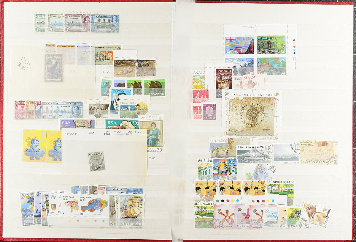 Nice consignment remainders of primarily mint worldwide material, 1900-1990's, in a stockbook, 2 albums, and loose material. There is quite a bit to digest here, with the strength of material in the stockbook, noting several British Commonwealth sets and partial sets, generally ranging from the 1930's to the 1950's, from Hong Kong, Canada (mh 50c Bluenose, Scott c.v. $245.00), India, Malay area, and more, with a spot check indicating some material cataloguing $20 to $40 each. The albums are sparsely filled with British Commonwealth material from countries ranging from F to Z, but did spot some sets and partial sets in the $10 to $20 catalogue range. We estimate roughly $50 of Canada face value postage as an added bonus. A very nice lot for collectors or dealers looking for stock. Estimate =