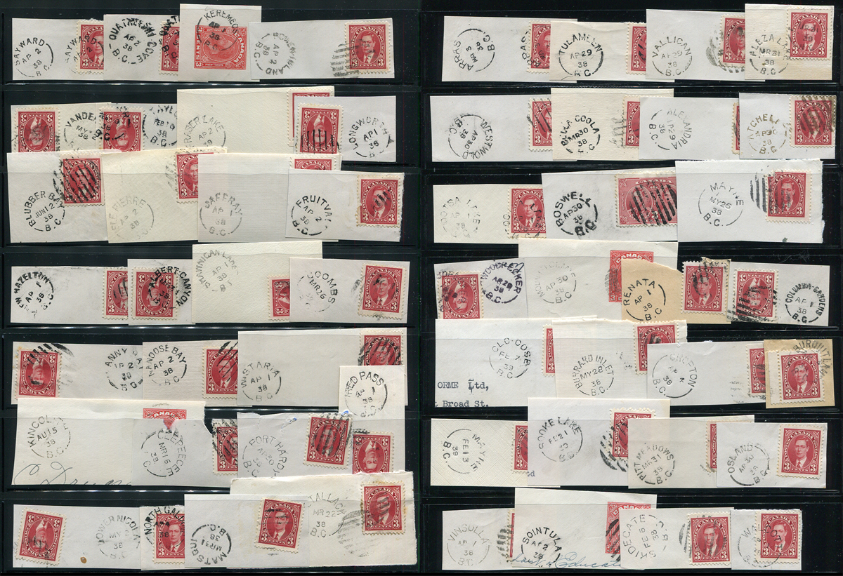 BC British Columbia Postmarks on stamp / piece x 53. An attractive group of 53x split ring cancels, including many closed Post Offices, all dated 1938 on stamp / piece (one of three lots we are offering in this sale from the same holding). Many better Post Offices noted, including Longworth, Taylor, Isle Pierre, Wistaria, Red Pass, Ceepeecee, Retallack, Vallican, Ootsa Lake, Woodpecker, Columbia Gardens, Sooke Lake, Osland and Vinsulla (to name a few). A great lot for the postmark hound. Estimate =