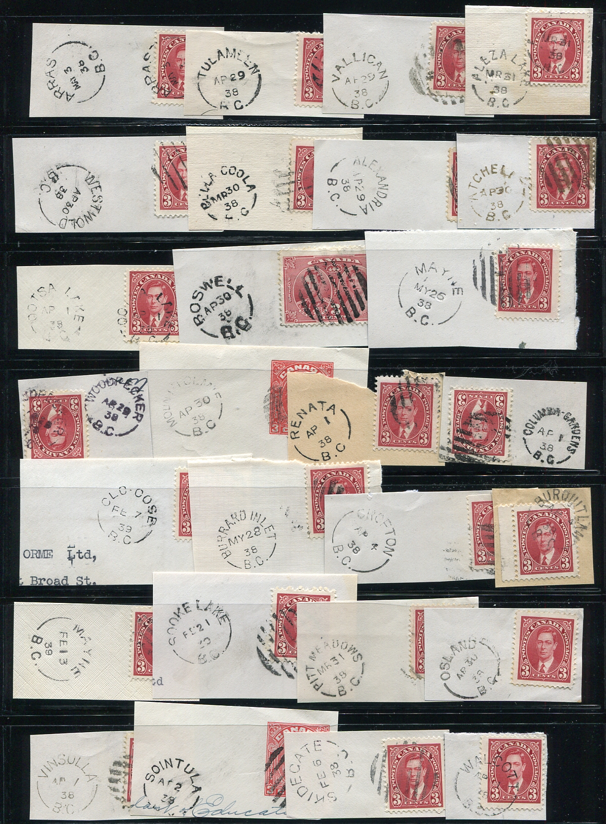 BC British Columbia Postmarks on stamp / piece x 53. An attractive group of 53x split ring cancels, including many closed Post Offices, all dated 1938 on stamp / piece (one of three lots we are offering in this sale from the same holding). Many better Post Offices noted, including Longworth, Taylor, Isle Pierre, Wistaria, Red Pass, Ceepeecee, Retallack, Vallican, Ootsa Lake, Woodpecker, Columbia Gardens, Sooke Lake, Osland and Vinsulla (to name a few). A great lot for the postmark hound. Estimate =