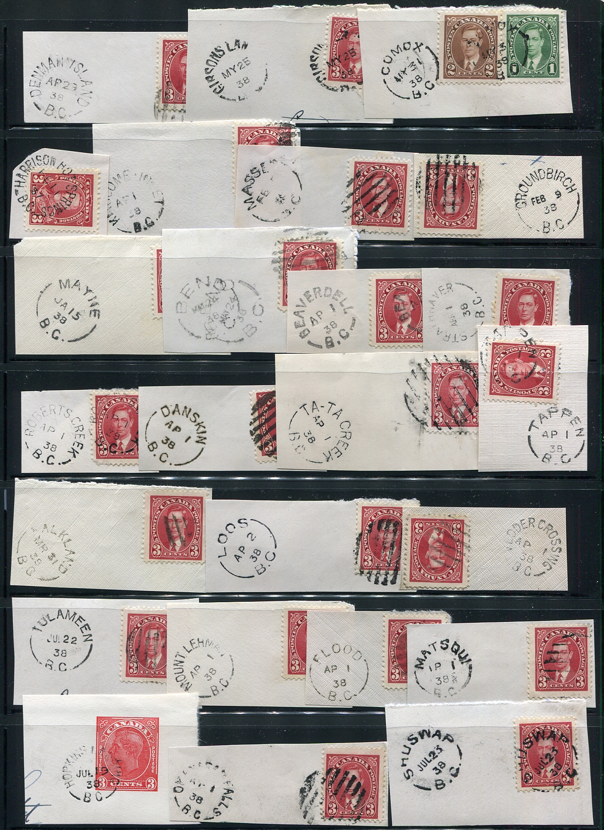 BC British Columbia Postmarks on stamp / piece x 55. A high-quality offering of 55x split ring cancels, including many closed Post Offices, all dated 1938 on stamp / piece (one of three lots we are offering in this sale from the same holding). Many better Post Offices noted, including Denman Island, Kingcome Inlet, Strathnaver, Bend, Danskin, Loos, Flood, Hopkins Landing, Oyster River, Perry Siding, Queens Bay, Needles, Forest Grove, Kersley, Stuart Island etc (to name a few). A great lot for the postmark hound. Estimate =