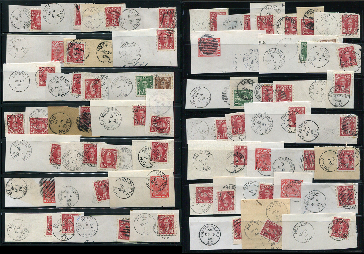 BC British Columbia Postmarks on stamp / piece x 57. An nice assortment of 57x CDS cancels, including many closed Post Offices, all dated 1938 on stamp / piece (one of three lots we are offering in this sale from the same holding). Many better Post Offices noted, including Minto Mine, Edgewood, East Pine, Donald Station, Slocan, Telegraph Cove, Bessborough, Wildwood Heights, Paldi, Reid Lake, Wingdam, Jura, Newlands Station, Gundy, James Island, Rounds etc (to name a few). A great lot for the postmark hound. Estimate =