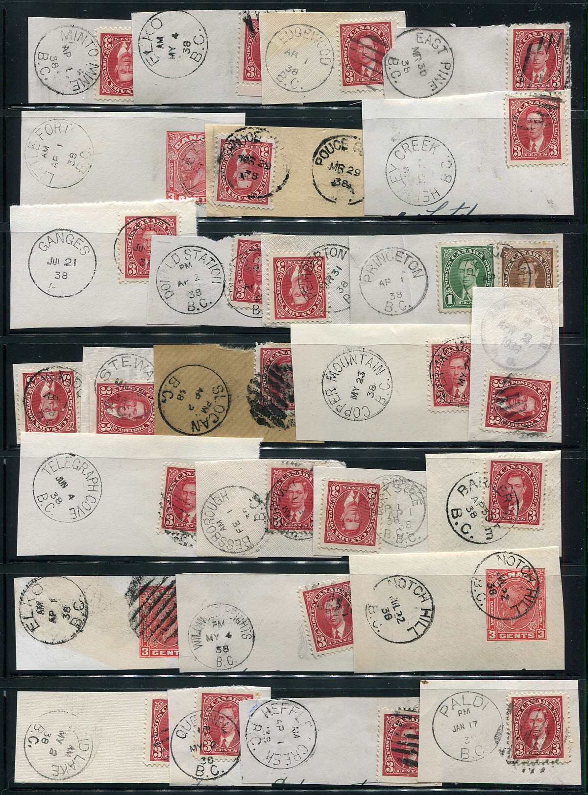 BC British Columbia Postmarks on stamp / piece x 57. An nice assortment of 57x CDS cancels, including many closed Post Offices, all dated 1938 on stamp / piece (one of three lots we are offering in this sale from the same holding). Many better Post Offices noted, including Minto Mine, Edgewood, East Pine, Donald Station, Slocan, Telegraph Cove, Bessborough, Wildwood Heights, Paldi, Reid Lake, Wingdam, Jura, Newlands Station, Gundy, James Island, Rounds etc (to name a few). A great lot for the postmark hound. Estimate =