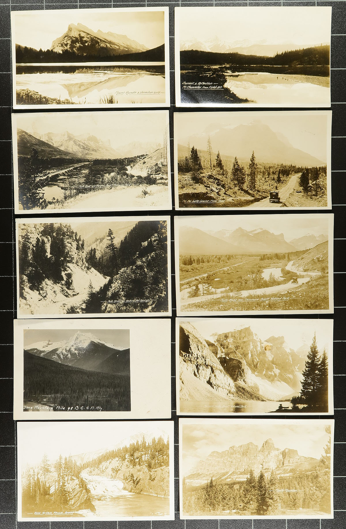 Postcards. The "Canadian Rockies" holding of 80x RPPC (Real Photo Postcards) featuring scenes of the Canadian Rockies and areas surrounding the BC/Alberta border. Noted several better postcards from Banff, Wildlife, Autos, Roads etc. Notable publishers / photographers including Gowen Sutton and Byron Harmon. Estimate =