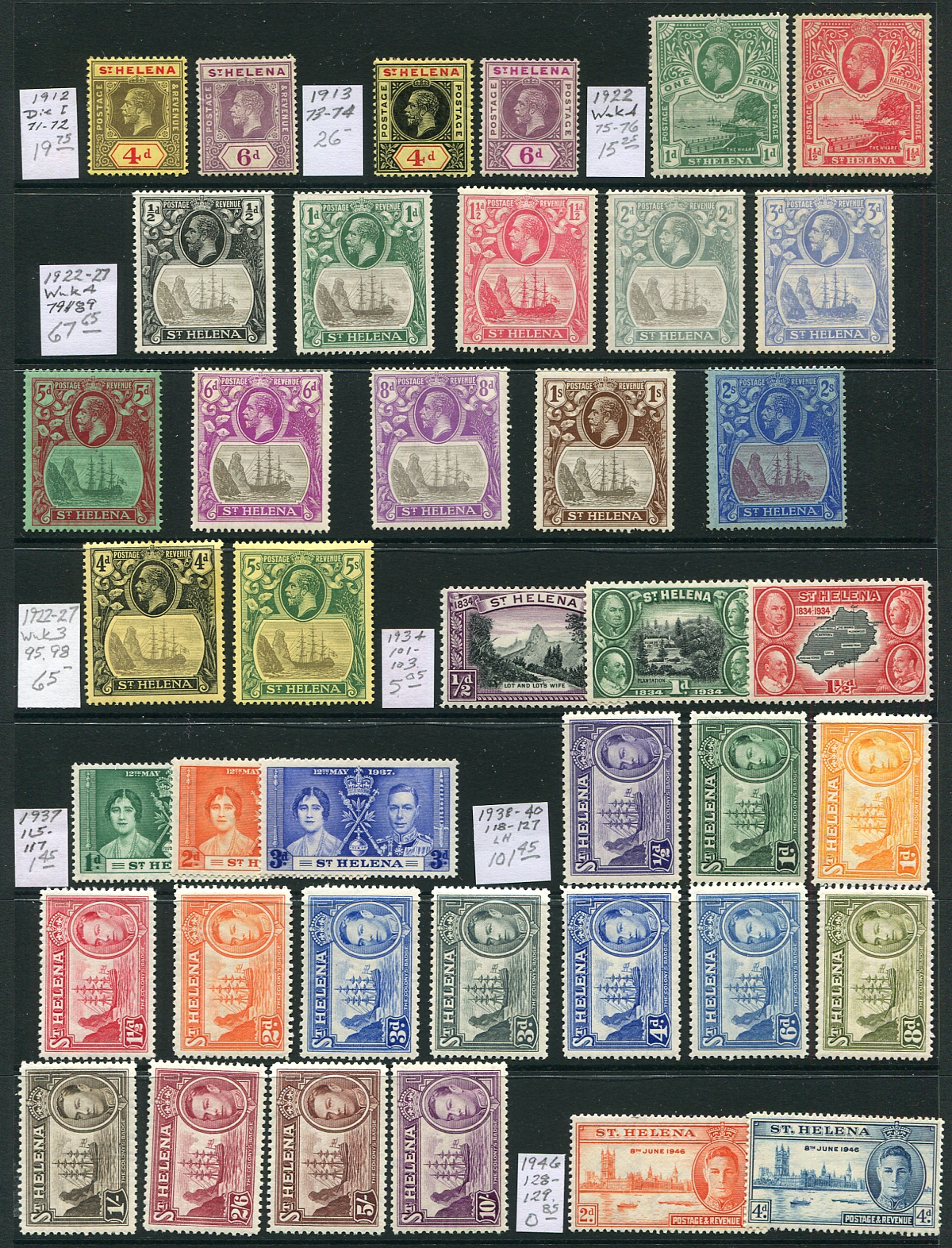 A combination offering consisting of Saint Helena featuring a primarily mint hinged / never hinged offering of 147 stamps, 1864-1970 (#5/235) catalogue US$929.25. Complemented nicely with a selection of Saint Christopher (#1/18) 1870-1886 with 10 stamps, both mint and used, catalogue US$186.00. All neatly arranged and identified on stockpages. 2026 Scott US$1,115.25 =