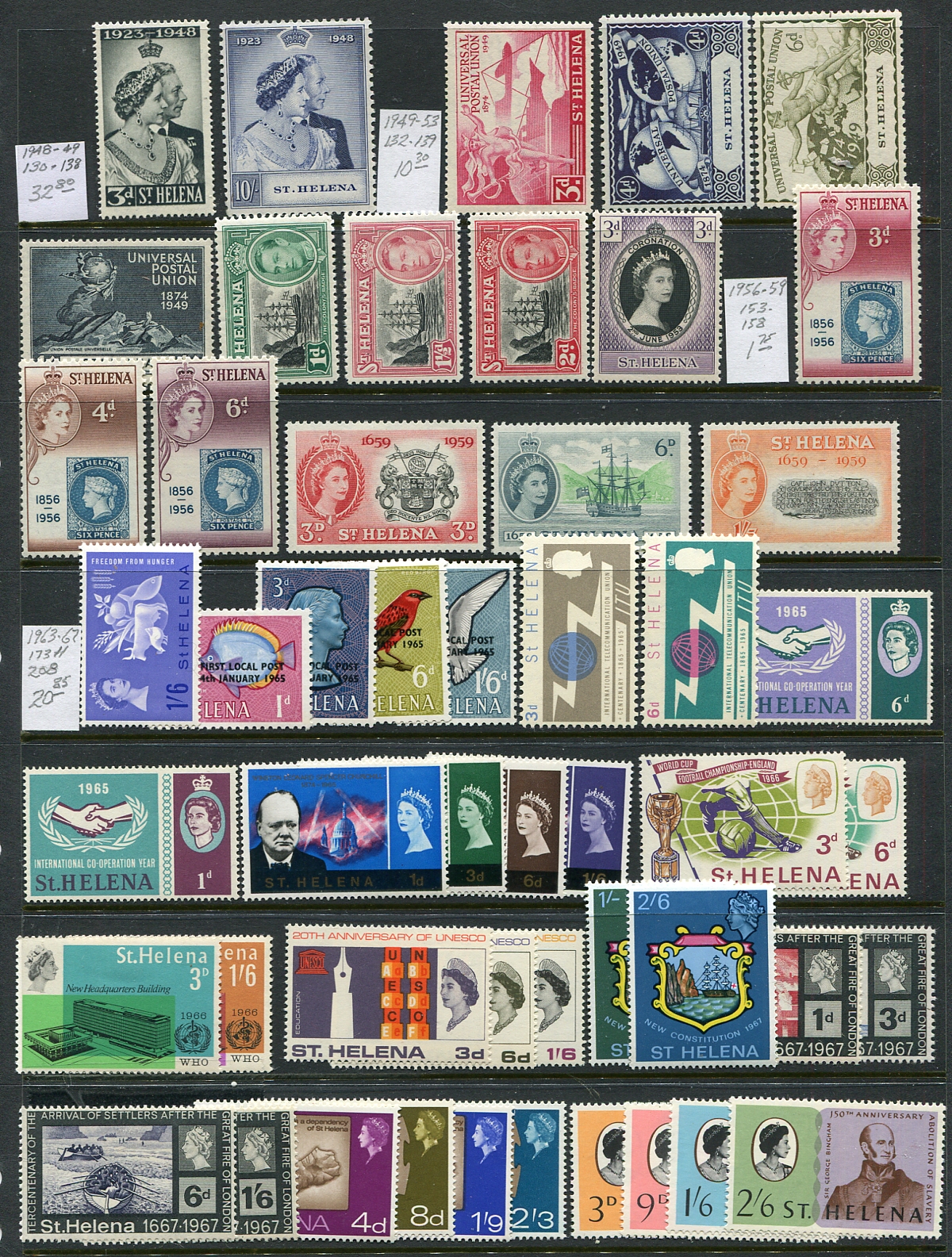 A combination offering consisting of Saint Helena featuring a primarily mint hinged / never hinged offering of 147 stamps, 1864-1970 (#5/235) catalogue US$929.25. Complemented nicely with a selection of Saint Christopher (#1/18) 1870-1886 with 10 stamps, both mint and used, catalogue US$186.00. All neatly arranged and identified on stockpages. 2026 Scott US$1,115.25 =