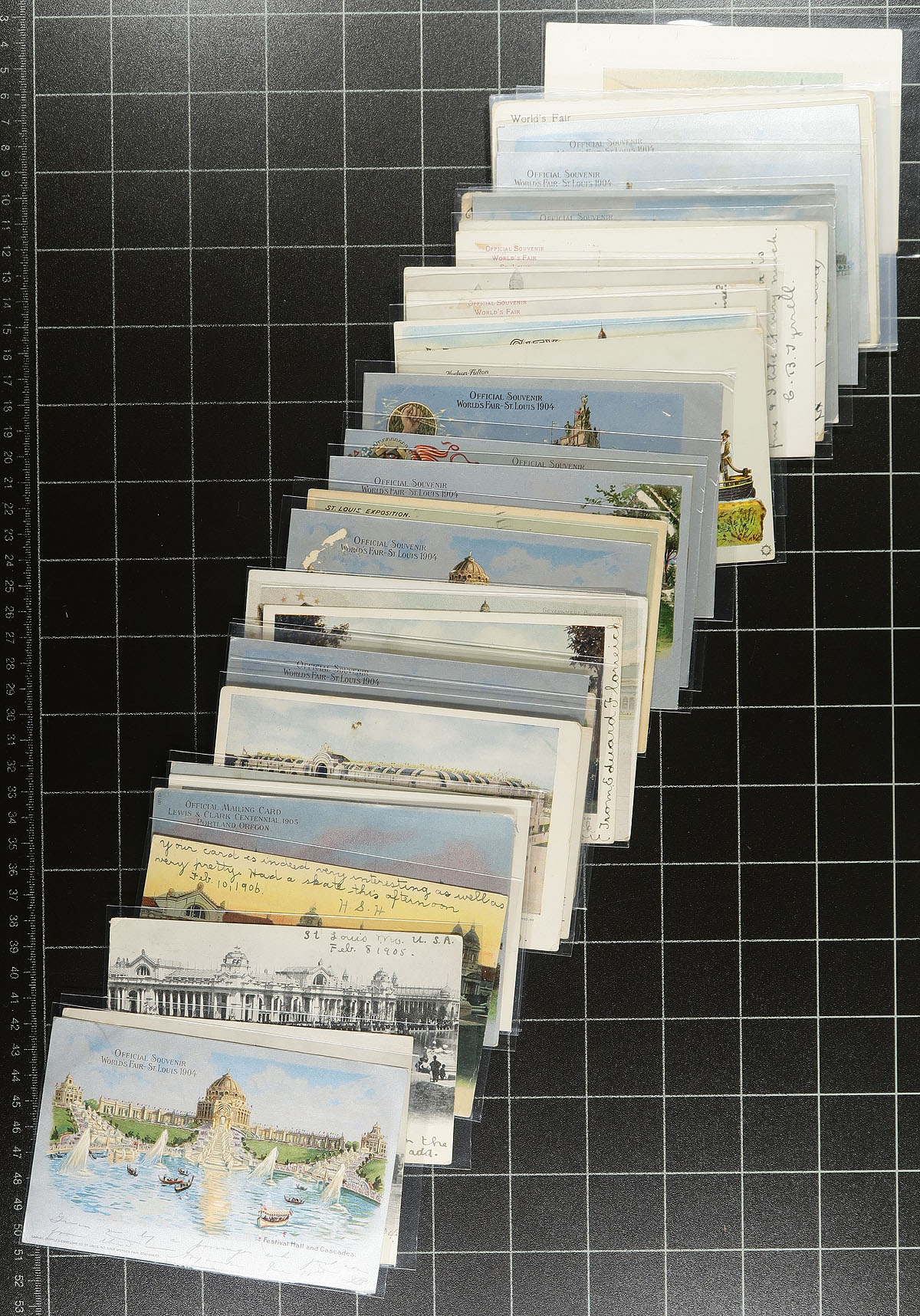 World Fair / Expositions / Fair Postcards. A group of 36 postcards, all featuring scenes from Expositions and Fairs. Primarily the 1904 World's Fair St. Louis and1905 Lewis & Clark Exposition (Portland, Oregon) but also with a few foreign (Franco British Exhibition) and other events. An interesting array of views including Pavilions, Art Palace, Mining Building, Palace of Electricity etc. Primarily unused, but we did note several used, including a 1904 St Louis Fair posted (in 1904) from Nagasaki, Japan to Canada. Well worth the estimated value. Estimate =