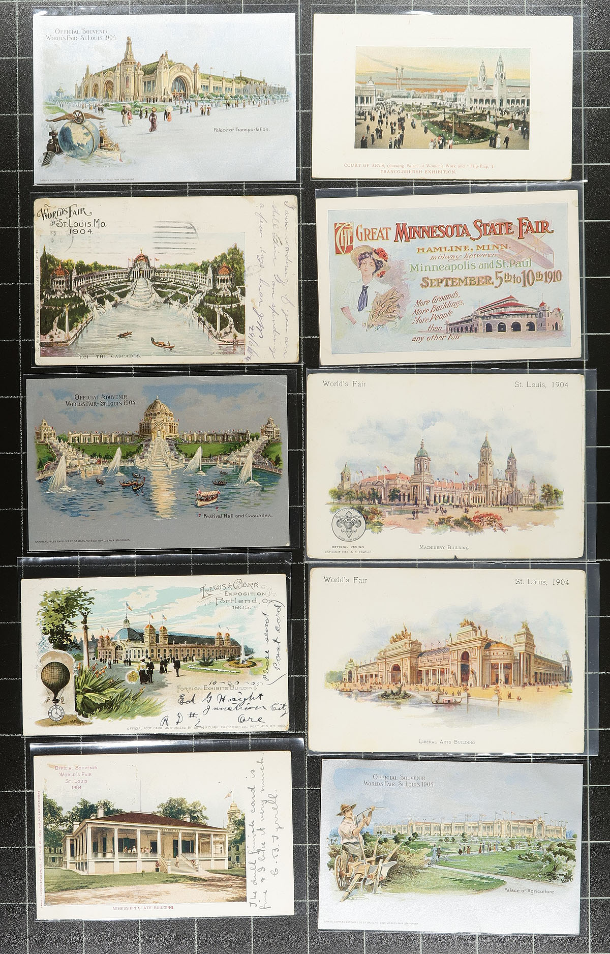 World Fair / Expositions / Fair Postcards. A group of 36 postcards, all featuring scenes from Expositions and Fairs. Primarily the 1904 World's Fair St. Louis and1905 Lewis & Clark Exposition (Portland, Oregon) but also with a few foreign (Franco British Exhibition) and other events. An interesting array of views including Pavilions, Art Palace, Mining Building, Palace of Electricity etc. Primarily unused, but we did note several used, including a 1904 St Louis Fair posted (in 1904) from Nagasaki, Japan to Canada. Well worth the estimated value. Estimate =