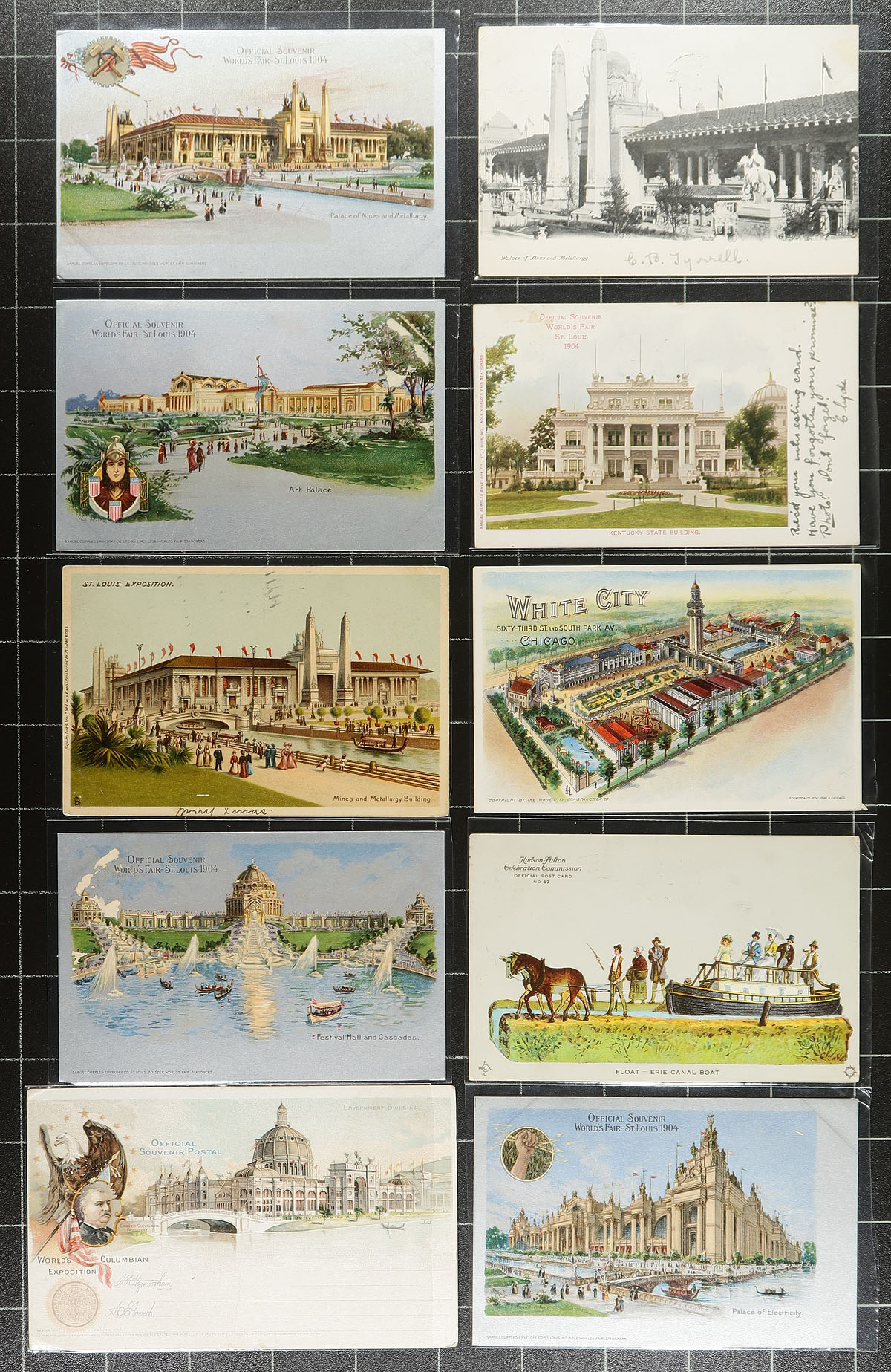 World Fair / Expositions / Fair Postcards. A group of 36 postcards, all featuring scenes from Expositions and Fairs. Primarily the 1904 World's Fair St. Louis and1905 Lewis & Clark Exposition (Portland, Oregon) but also with a few foreign (Franco British Exhibition) and other events. An interesting array of views including Pavilions, Art Palace, Mining Building, Palace of Electricity etc. Primarily unused, but we did note several used, including a 1904 St Louis Fair posted (in 1904) from Nagasaki, Japan to Canada. Well worth the estimated value. Estimate =