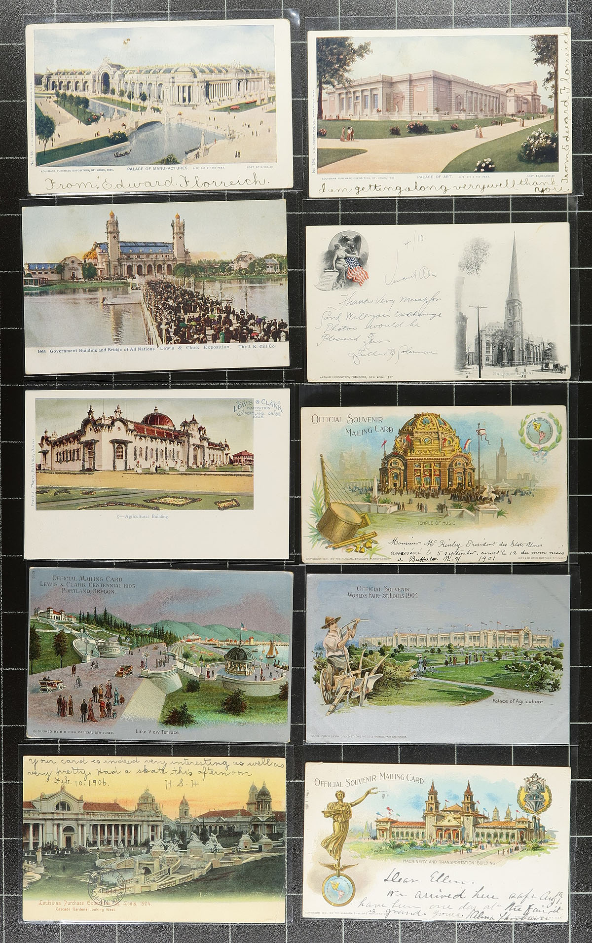 World Fair / Expositions / Fair Postcards. A group of 36 postcards, all featuring scenes from Expositions and Fairs. Primarily the 1904 World's Fair St. Louis and1905 Lewis & Clark Exposition (Portland, Oregon) but also with a few foreign (Franco British Exhibition) and other events. An interesting array of views including Pavilions, Art Palace, Mining Building, Palace of Electricity etc. Primarily unused, but we did note several used, including a 1904 St Louis Fair posted (in 1904) from Nagasaki, Japan to Canada. Well worth the estimated value. Estimate =