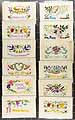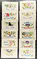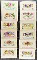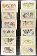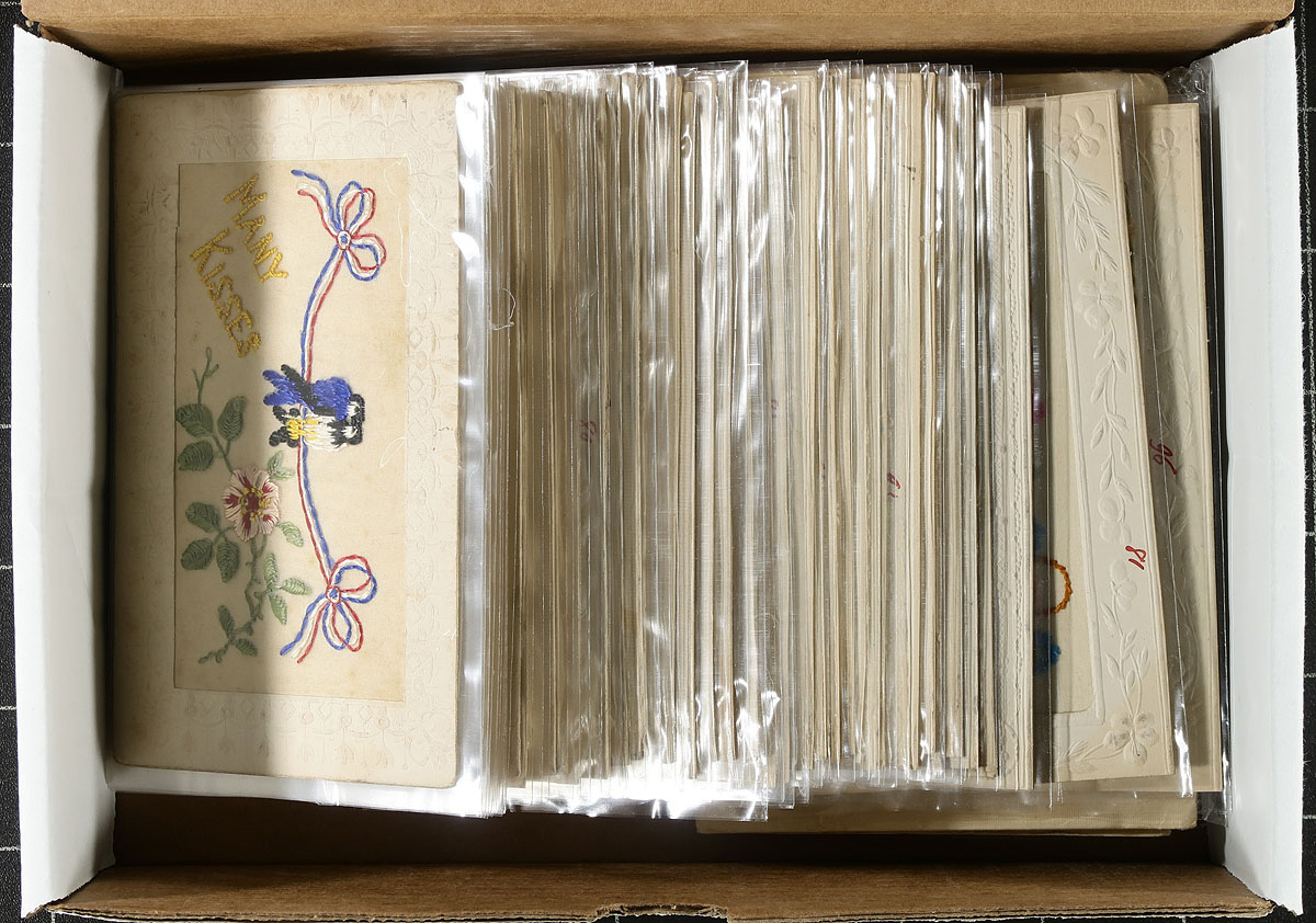 Large accumulation of "Silk" greeting postcards. These silk embroidered postcards which were a premium postcard item at the time were very popular during the WWI period, especially with soldiers serving in France to send back home (often within an envelope to protect them) to their sweetheart or family member. A very clean offering of these desirable postcard, all in plastic sleeves as assembled by the collector. These often retail for $20.00-$30.00 each. Estimate =