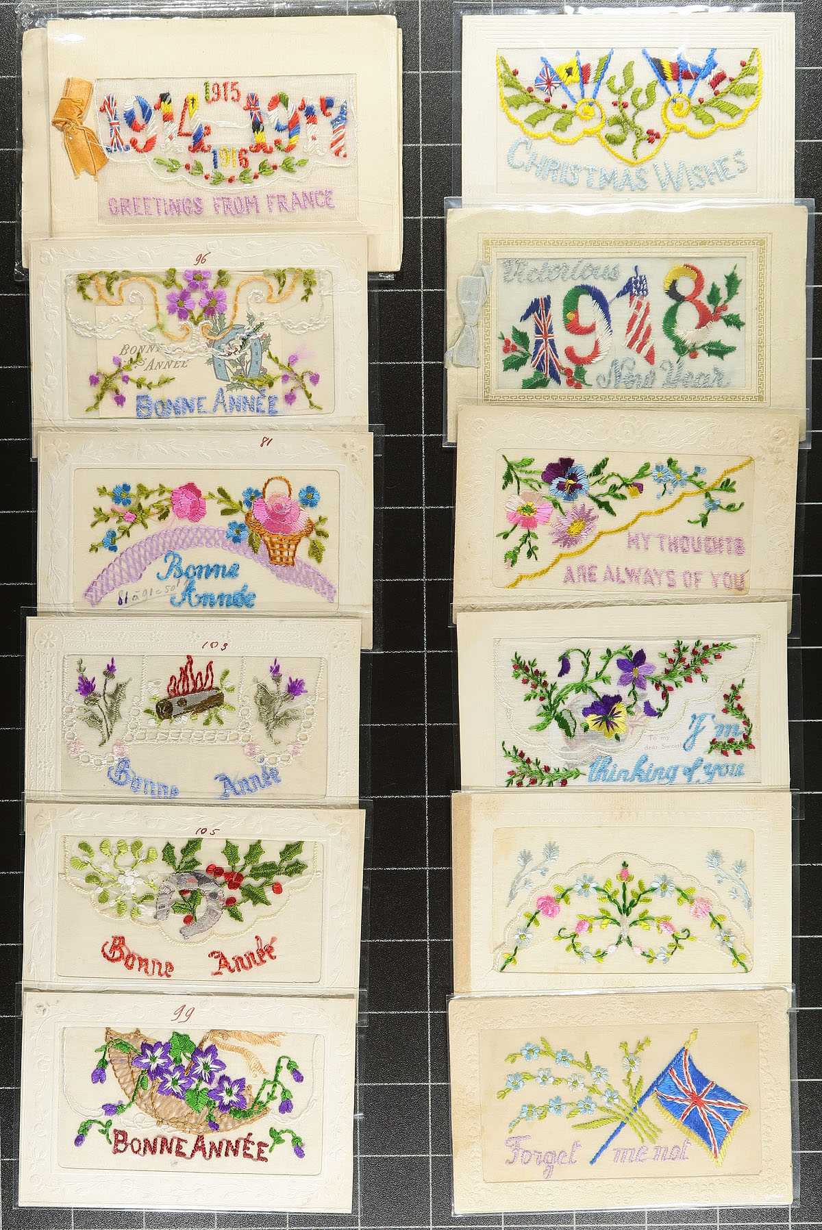 Large accumulation of "Silk" greeting postcards. These silk embroidered postcards which were a premium postcard item at the time were very popular during the WWI period, especially with soldiers serving in France to send back home (often within an envelope to protect them) to their sweetheart or family member. A very clean offering of these desirable postcard, all in plastic sleeves as assembled by the collector. These often retail for $20.00-$30.00 each. Estimate =