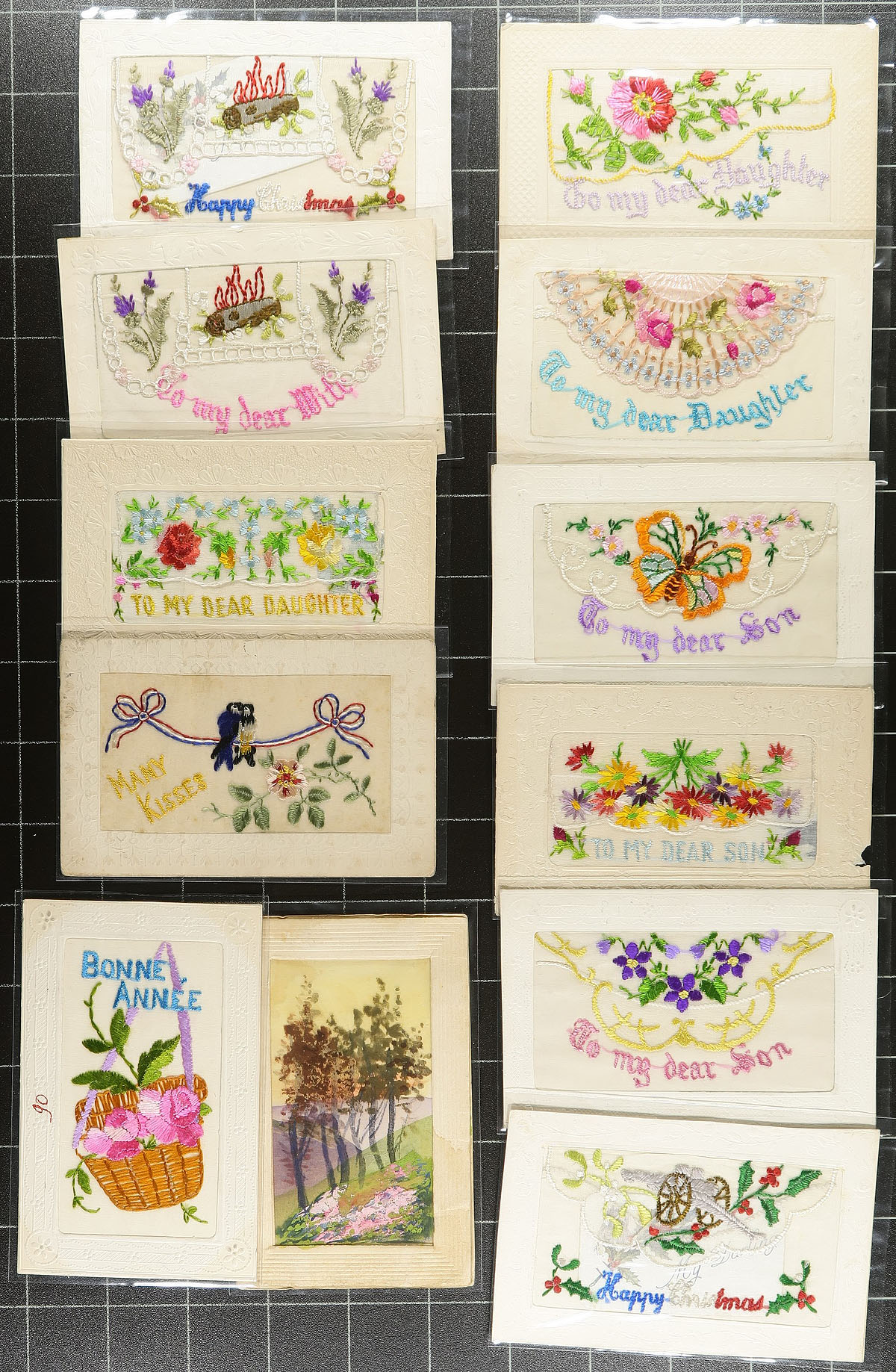 Large accumulation of "Silk" greeting postcards. These silk embroidered postcards which were a premium postcard item at the time were very popular during the WWI period, especially with soldiers serving in France to send back home (often within an envelope to protect them) to their sweetheart or family member. A very clean offering of these desirable postcard, all in plastic sleeves as assembled by the collector. These often retail for $20.00-$30.00 each. Estimate =