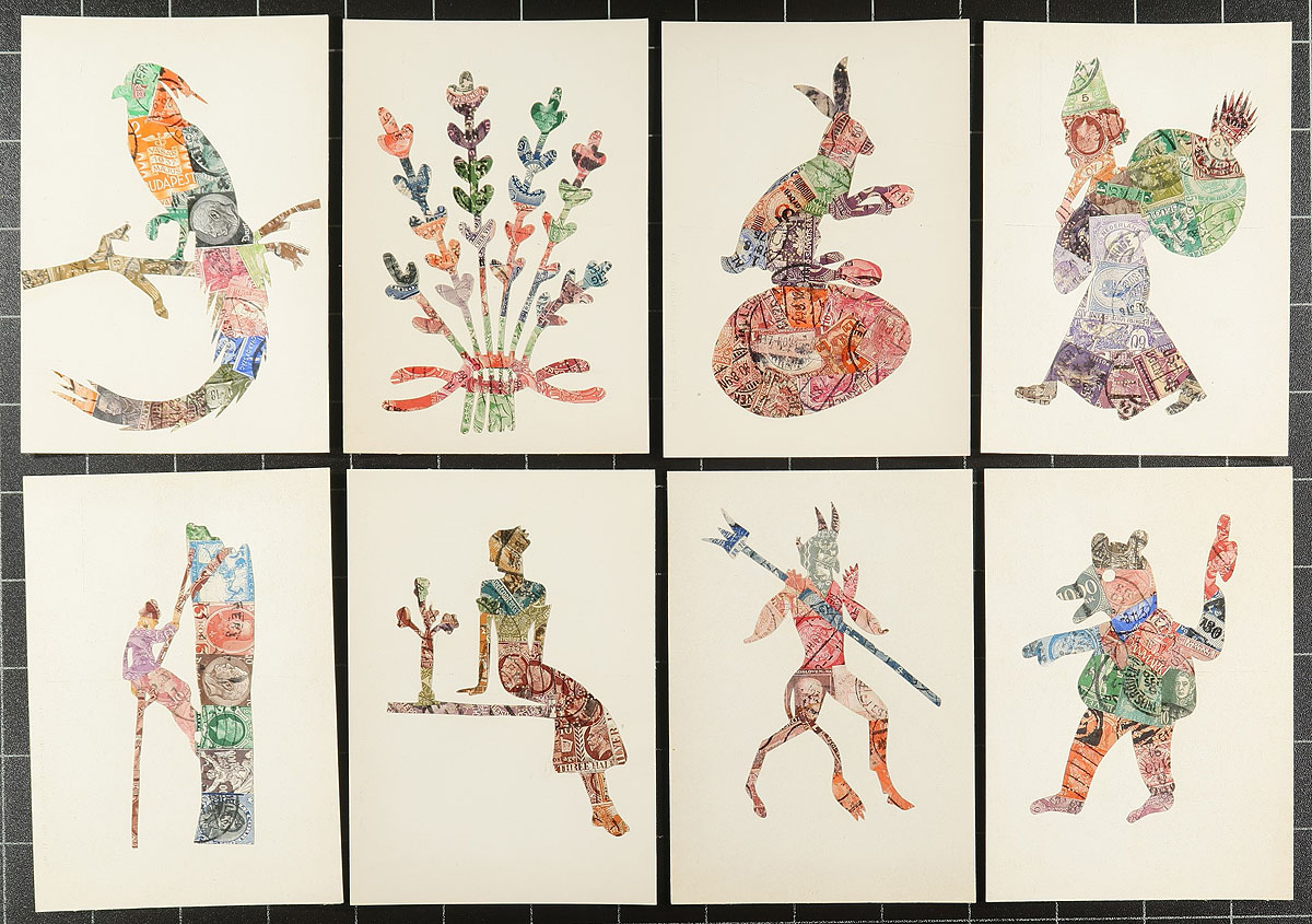An eye-catching array of "stamp art" postcards x31, which feature creatively trimmed postage stamps, used as collage material for colour to make up a "silhouette" image. These postcards look to all be made by the same artist, and judging by the stamps used, date to the 1930's (although stamps go back to the turn of the Century). We note stamps used from Germany, Japan, Austria, Netherlands, Canada, Hungary, Switzerland, UK (and more). A nice lot which would make for an excellent conversation piece of "something different". Estimate =
