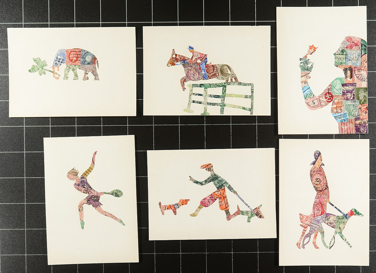 An eye-catching array of "stamp art" postcards x31, which feature creatively trimmed postage stamps, used as collage material for colour to make up a "silhouette" image. These postcards look to all be made by the same artist, and judging by the stamps used, date to the 1930's (although stamps go back to the turn of the Century). We note stamps used from Germany, Japan, Austria, Netherlands, Canada, Hungary, Switzerland, UK (and more). A nice lot which would make for an excellent conversation piece of "something different". Estimate =