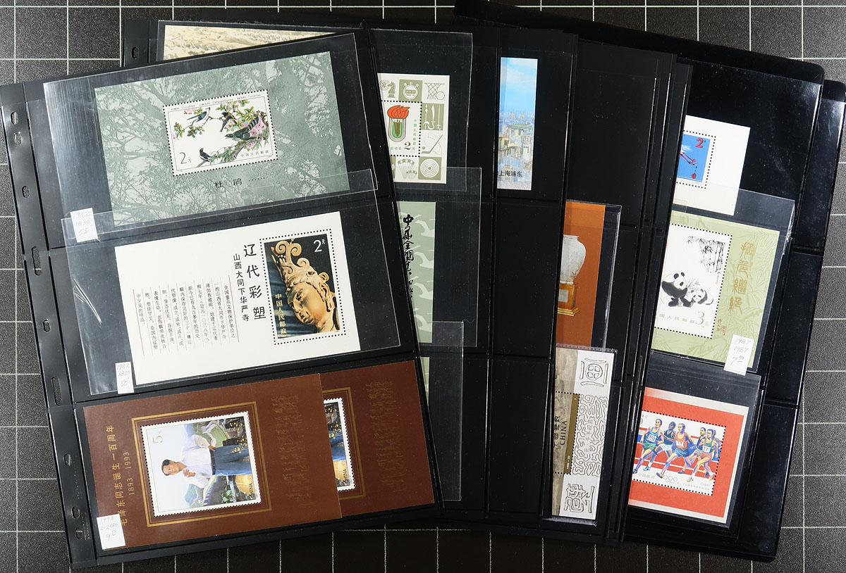 Lovely group of 57 never hinged Peoples Republic of China souvenir sheets, 1979-1996, neatly organized and identified by Scott numbers with current catalogue values, in 9 double sided stock pages. We note many sheets cataloguing $10 to $30 and up including #s 1497 (c.v. $90) 1810 ($55), 1863 ($70). All pages photographed online. A lovely group for collectors and dealers alike. 2026 Scott US$759.00 =