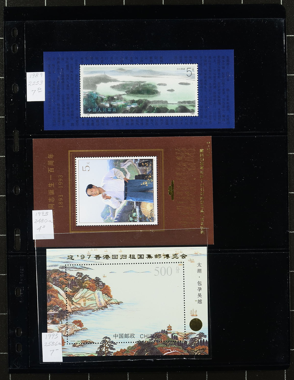 Lovely group of 57 never hinged Peoples Republic of China souvenir sheets, 1979-1996, neatly organized and identified by Scott numbers with current catalogue values, in 9 double sided stock pages. We note many sheets cataloguing $10 to $30 and up including #s 1497 (c.v. $90) 1810 ($55), 1863 ($70). All pages photographed online. A lovely group for collectors and dealers alike. 2026 Scott US$759.00 =