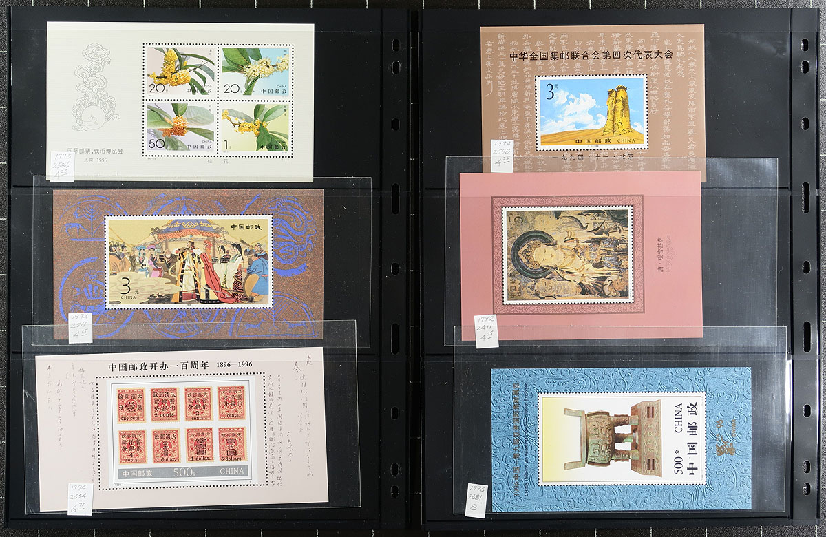 Lovely group of 57 never hinged Peoples Republic of China souvenir sheets, 1979-1996, neatly organized and identified by Scott numbers with current catalogue values, in 9 double sided stock pages. We note many sheets cataloguing $10 to $30 and up including #s 1497 (c.v. $90) 1810 ($55), 1863 ($70). All pages photographed online. A lovely group for collectors and dealers alike. 2026 Scott US$759.00 =