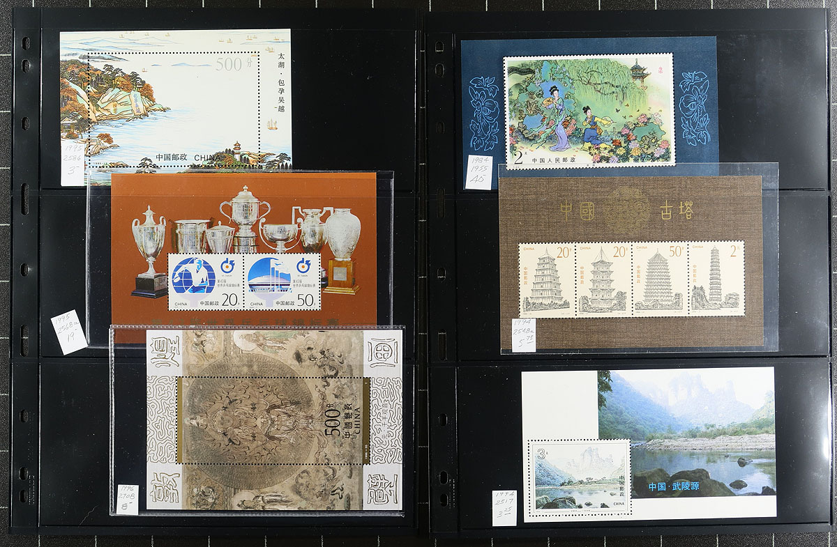 Lovely group of 57 never hinged Peoples Republic of China souvenir sheets, 1979-1996, neatly organized and identified by Scott numbers with current catalogue values, in 9 double sided stock pages. We note many sheets cataloguing $10 to $30 and up including #s 1497 (c.v. $90) 1810 ($55), 1863 ($70). All pages photographed online. A lovely group for collectors and dealers alike. 2026 Scott US$759.00 =