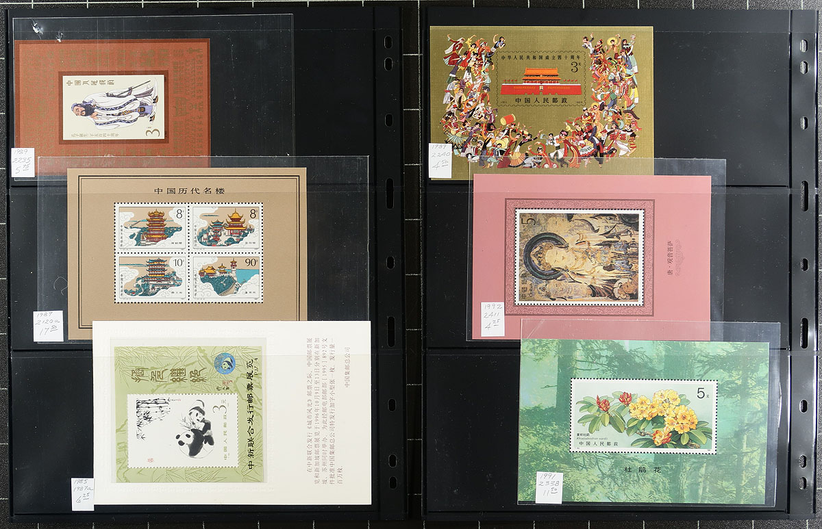Lovely group of 57 never hinged Peoples Republic of China souvenir sheets, 1979-1996, neatly organized and identified by Scott numbers with current catalogue values, in 9 double sided stock pages. We note many sheets cataloguing $10 to $30 and up including #s 1497 (c.v. $90) 1810 ($55), 1863 ($70). All pages photographed online. A lovely group for collectors and dealers alike. 2026 Scott US$759.00 =