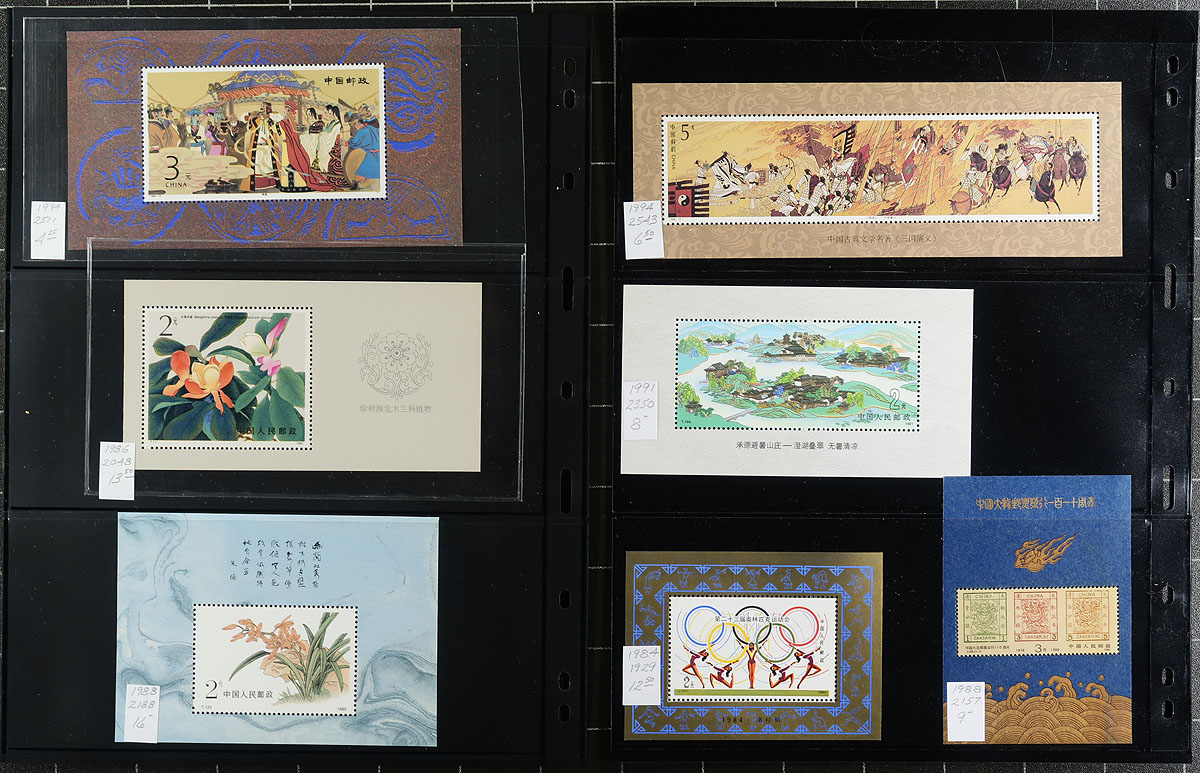 Lovely group of 57 never hinged Peoples Republic of China souvenir sheets, 1979-1996, neatly organized and identified by Scott numbers with current catalogue values, in 9 double sided stock pages. We note many sheets cataloguing $10 to $30 and up including #s 1497 (c.v. $90) 1810 ($55), 1863 ($70). All pages photographed online. A lovely group for collectors and dealers alike. 2026 Scott US$759.00 =