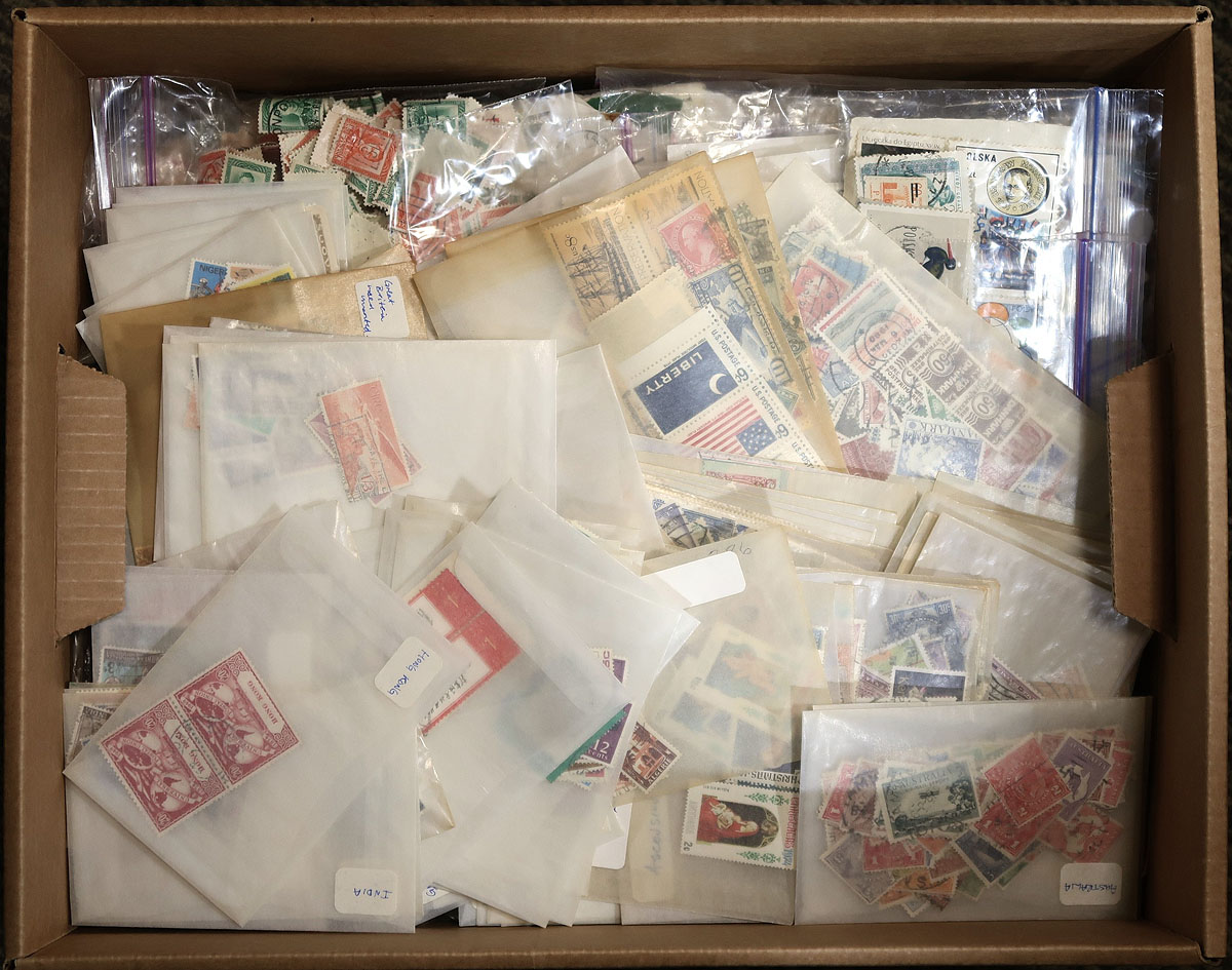 Interesting worldwide kiloware mixture filling a bankers box. The lot contains thousands of stamps, generally well organized into bags and glassines, along with the typical mixture of material in a large box etc. A cursory check indicated better representation from Asia, including People's Republic of China (noting a pair of Scott #968, c.v. $66 total, and a few other stamps from the 1967-1972 period), China, and Japan, along with France and other European countries and much more, noting many town postmarks and types. A nice lot for the dedicated collector / sorter with several possible finds. Overall fine to very fine. Estimate =