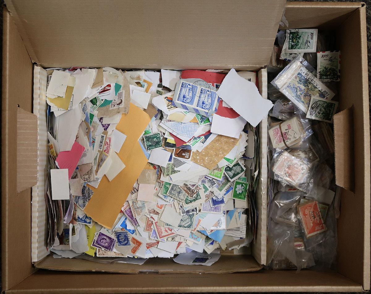 Interesting worldwide kiloware mixture filling a bankers box. The lot contains thousands of stamps, generally well organized into bags and glassines, along with the typical mixture of material in a large box etc. A cursory check indicated better representation from Asia, including People's Republic of China (noting a pair of Scott #968, c.v. $66 total, and a few other stamps from the 1967-1972 period), China, and Japan, along with France and other European countries and much more, noting many town postmarks and types. A nice lot for the dedicated collector / sorter with several possible finds. Overall fine to very fine. Estimate =
