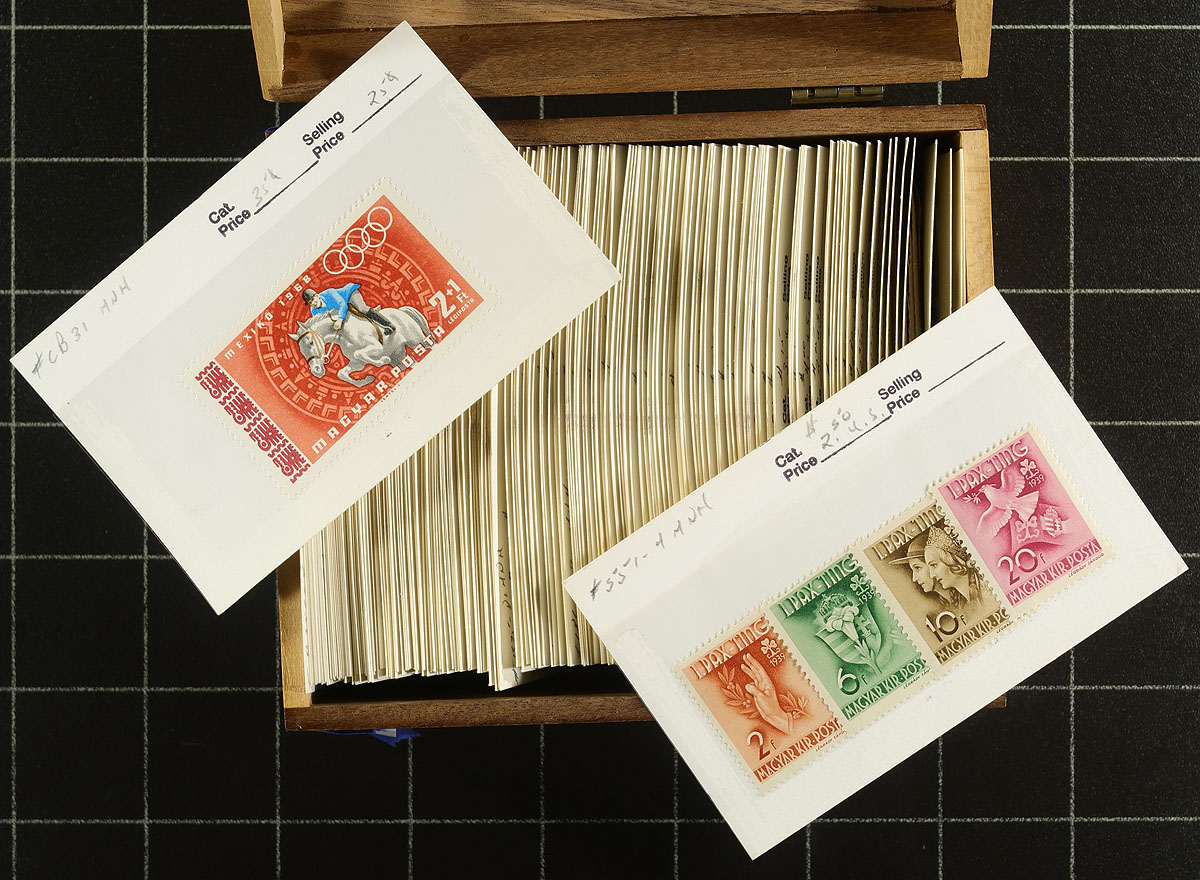 Well organized group of never hinged Hungary singles and sets, 1950's-1990's, all well identified in 102 cards with older catalogue values. We note roughly 175 different sets ranging from Scott #1043/3514, along with semi-postals from #B207/B358a. A nice clean lot for collectors and dealers alike, noting several topical and thematic possibilities. Very fine. 2026 Scott US$459.00 =
